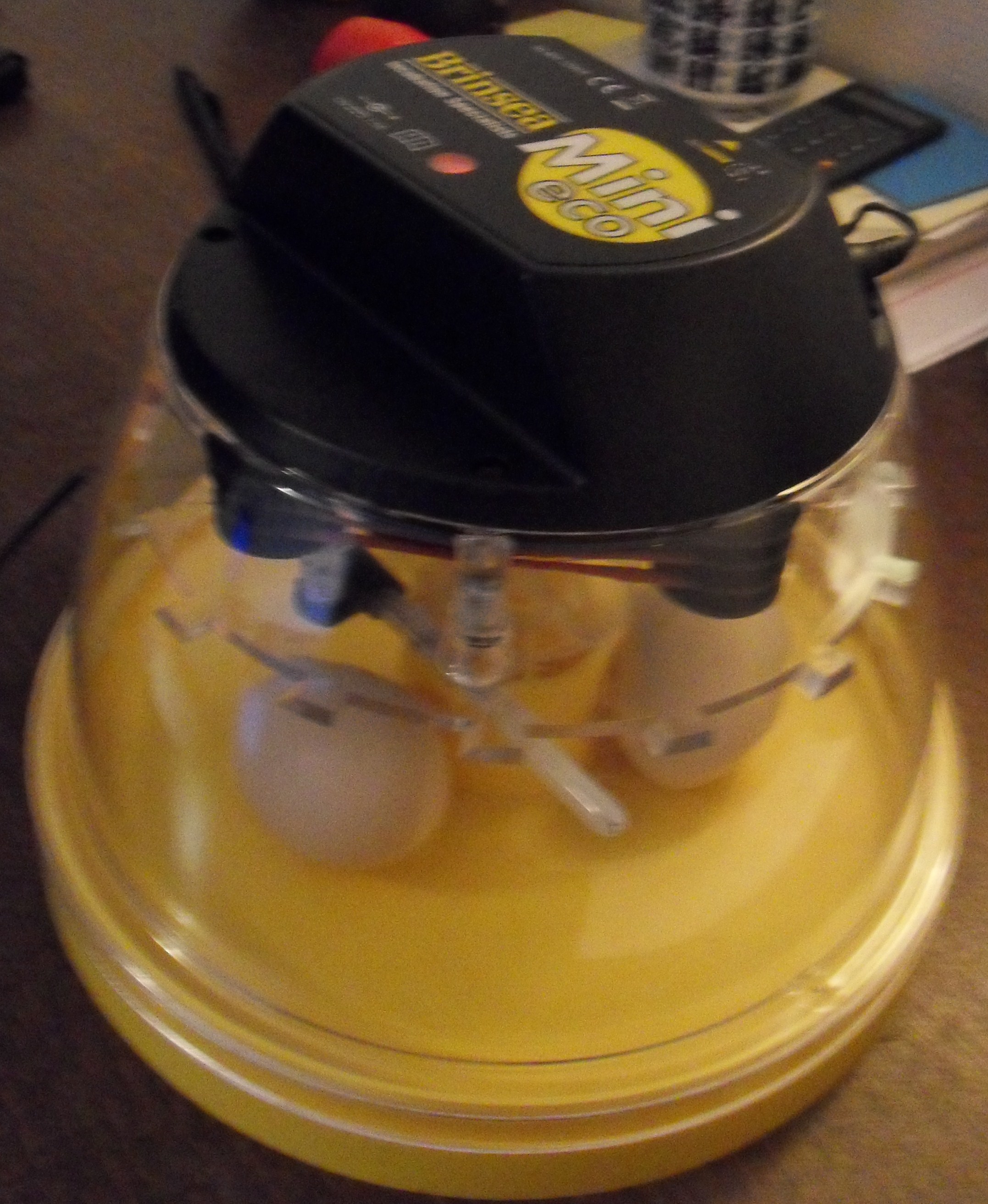 Vi valde en liten äggkläckare. I den här får det plats 10 st hönsägg. Här har vi nu 2 st ägg som väntas kläckas på långfredag. Förhoppningsvis blir det kycklingar, trots svårigheterna att hålla jämn temperatur i kylväskan.