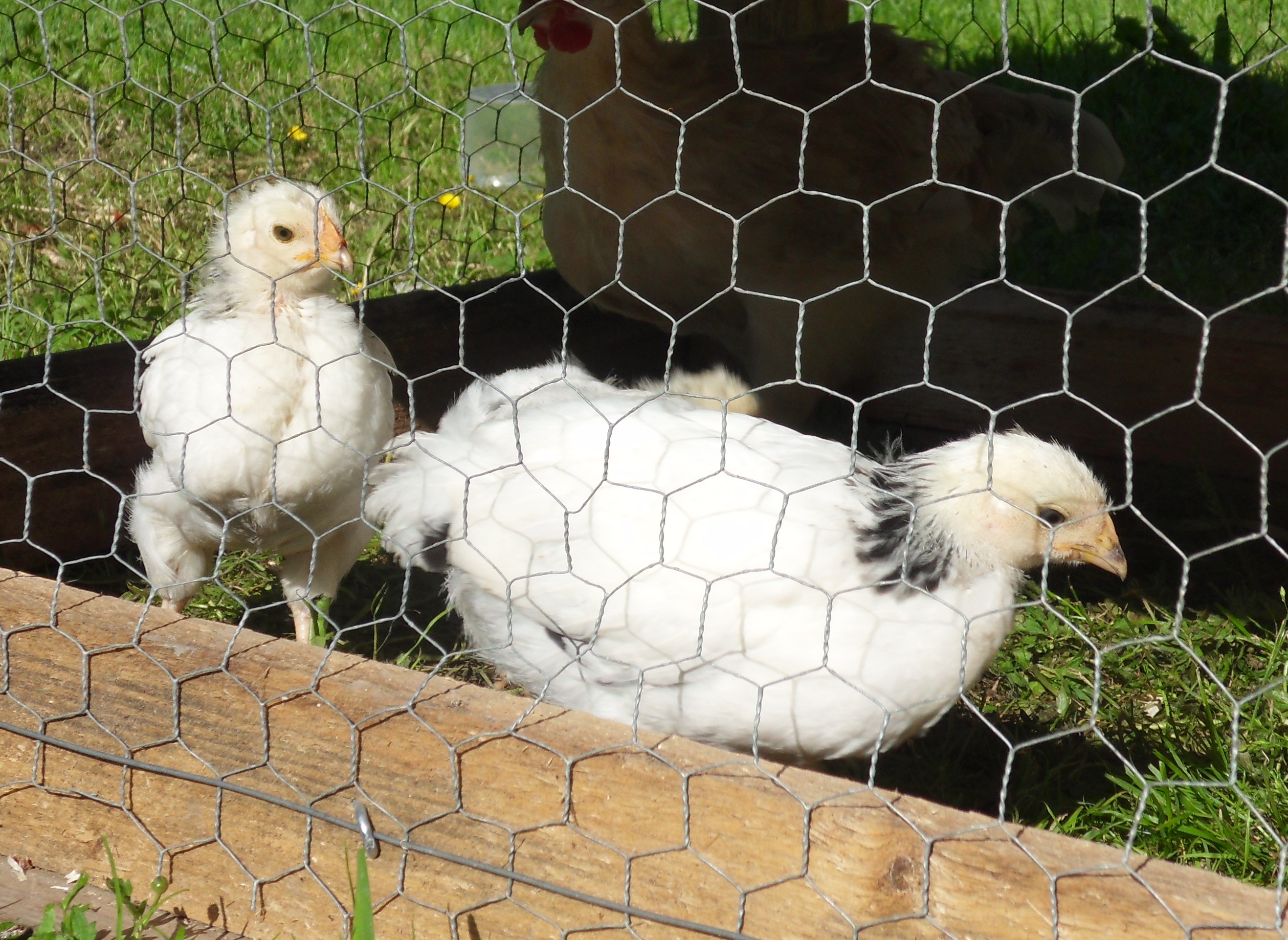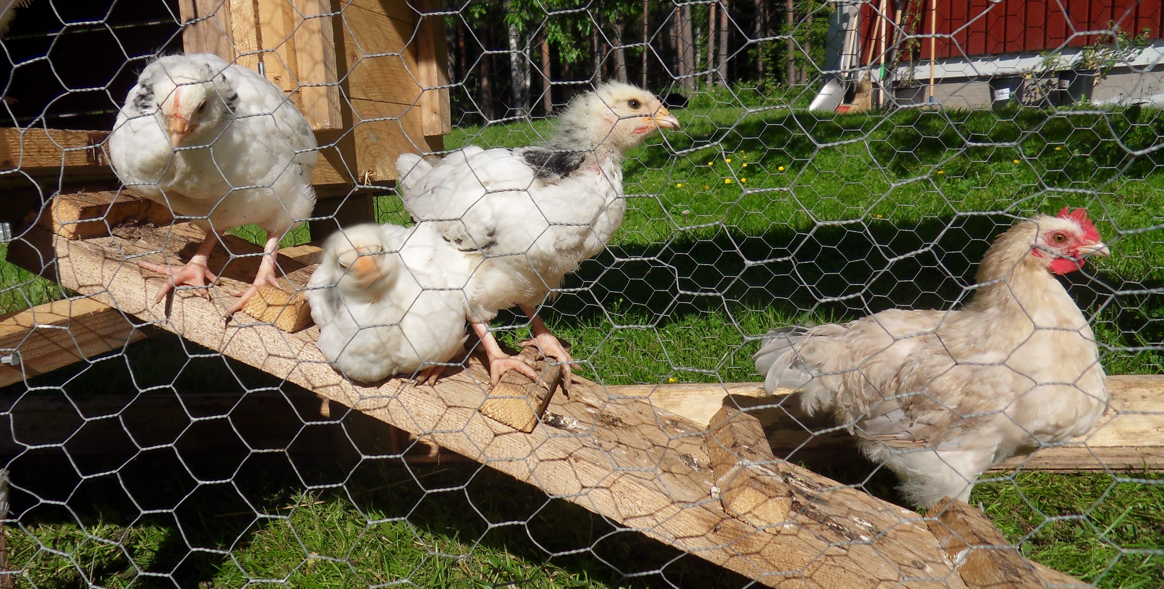 Nu så är de 4 veckor, våra Sussexkycklingar. Hedemorahönan är 11 veckor. Sussexkycklingarna fick fjädrar väldigt snabbt och saknar nu bara lite fjädrar på huvudet. De är väldigt pigga och nyfikna. Buren de är i får vi flytta flera gånger om dagen, de äter massor av gräs och letar mask. Ett hönshus är på gång, så de kommer snart att få mer plats att vara på.