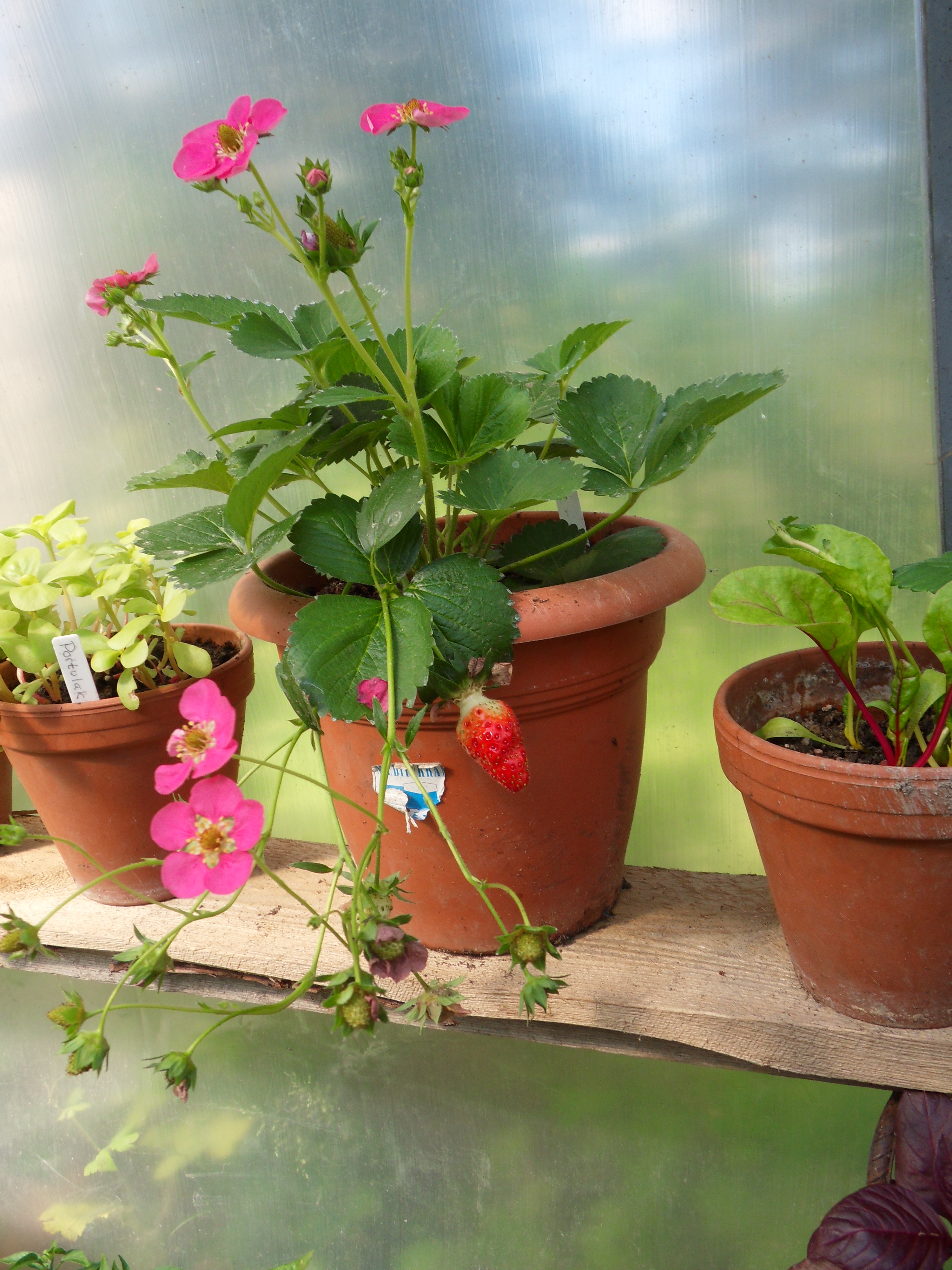 Jordgubben ”Rainbow Treasure” från Rara växter. Vi har provsmakat den, god men inte så stark jordgubbssmak. Den får absolut vara kvar.