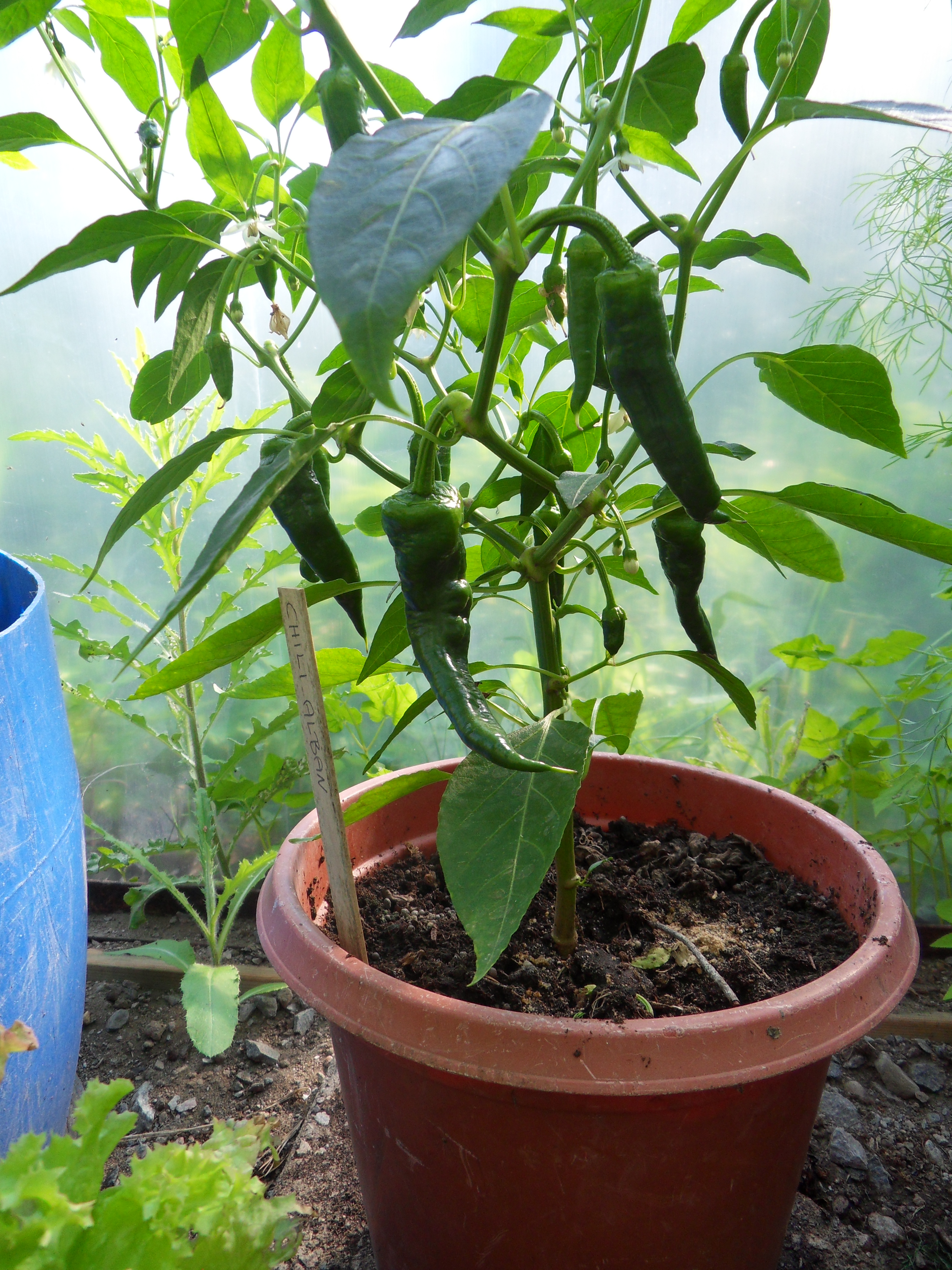 Chilin Alban från Runåbergs fröer, växer bra. Ska vara en bra allround chili. Rapporterar när den blivit röd och vi provat den. Hos oss är det jag som odlar och maken som är kocken och han älskar chili så vi kommer att prova på våra 5 chilisorter i det mesta framöver. I bakgrunden syns lite tistel o kirskål, sånt växer också bra i växthuset..