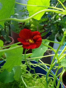 Krassen ”Sahins Mambo” från Rara växter, börjar blomma. Det ska bli krämvita blommor på den också. Den växer snabbt, den är strax uppe i taket på växthuset.