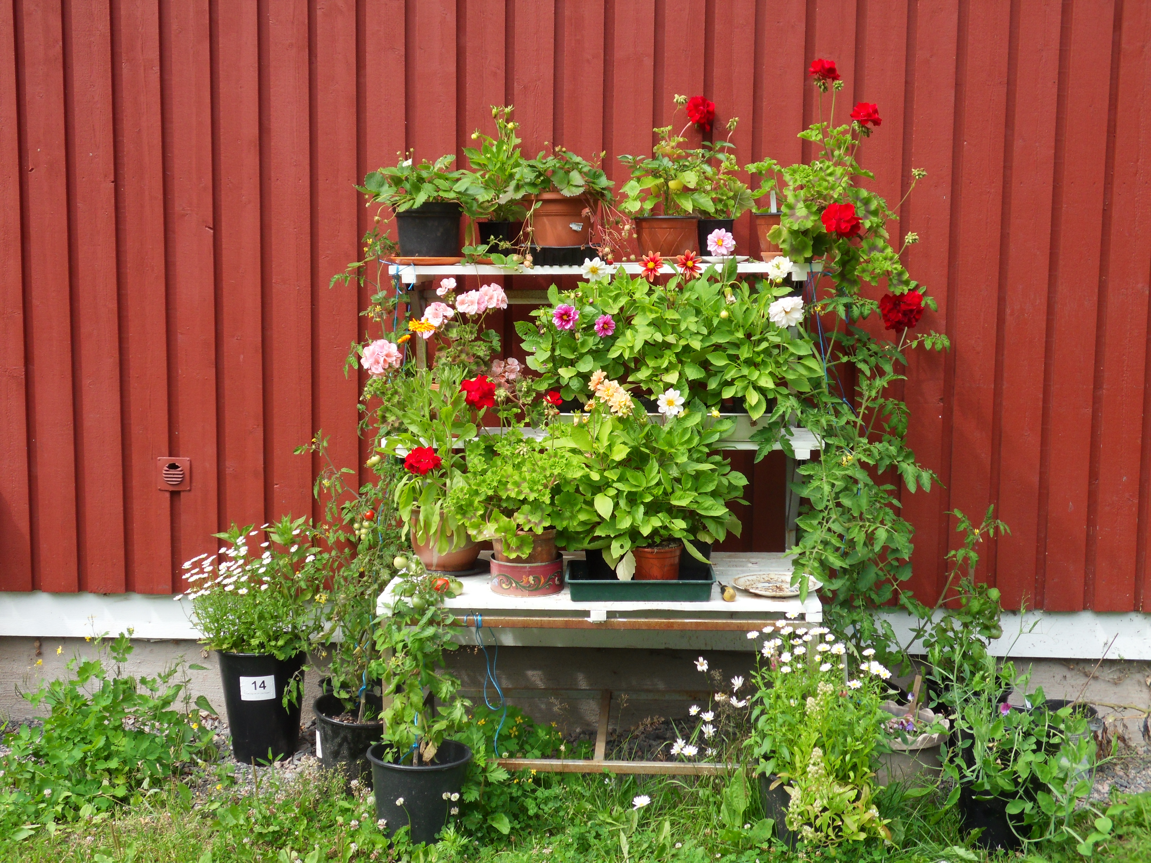 Här hamnade tomater, jordgubbar och blommor jag inte hade plats för någon annanstans. Den står där vi parkerar våra bilar, så det är rätt trevligt att mötas av den här hyllan när vi kör upp på gårdsplanen.