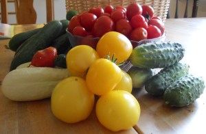 Men nu är det skördedags! Tomater och gurkor i mängder, så idag kokas det ”het tomatsås” och mer gurka läggs in.