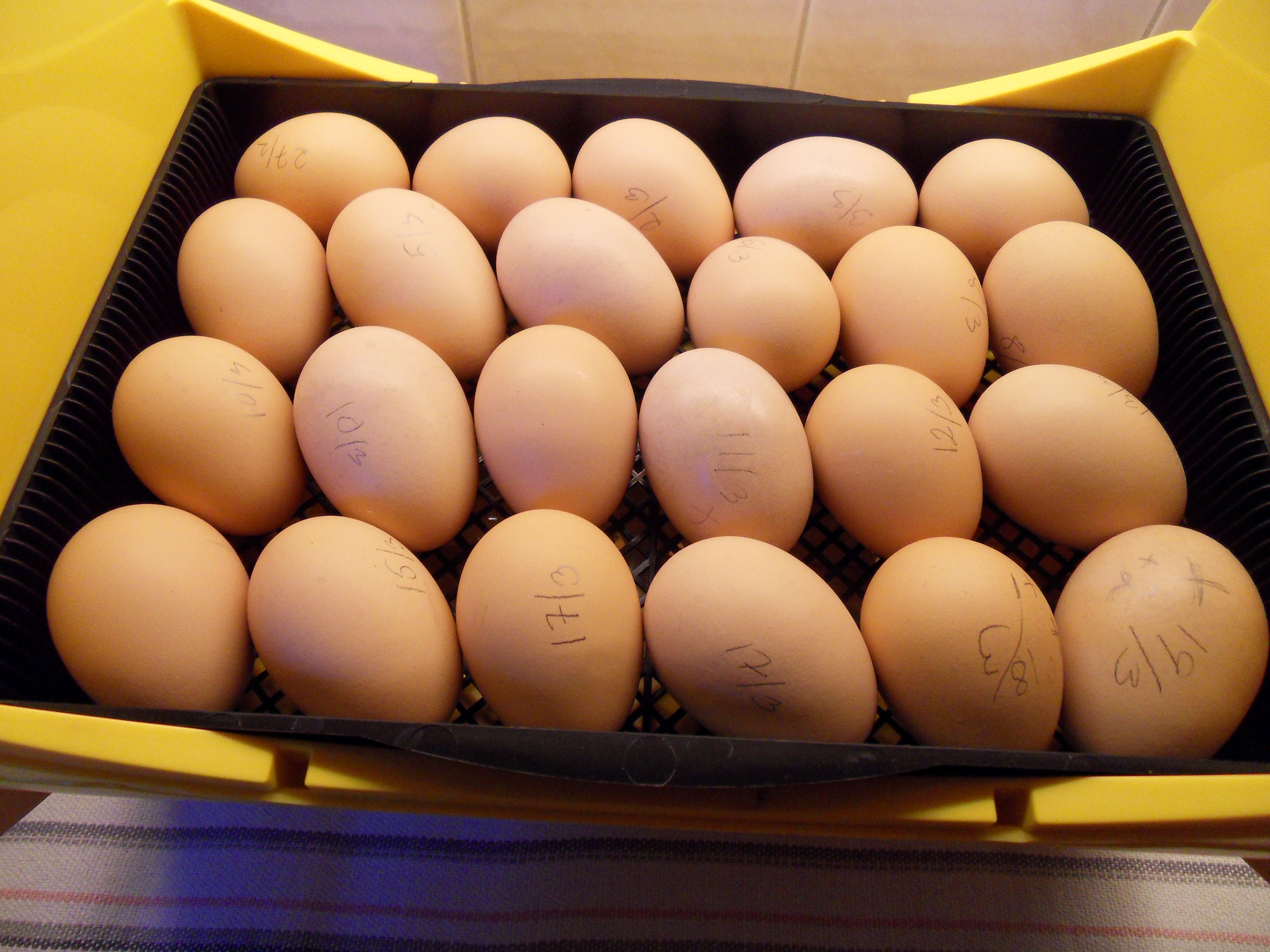 Jag har skrivit datum på äggen, när de är värpta, för att koll på om det är sämre kläckning på de äldre äggen. De äldsta äggen var 17 dagar gamla när vi lade dem i kläckaren. Vi samlade på dem tills vi hade så kläckaren blev full, för att alla ägg ska kläckas samma dag.