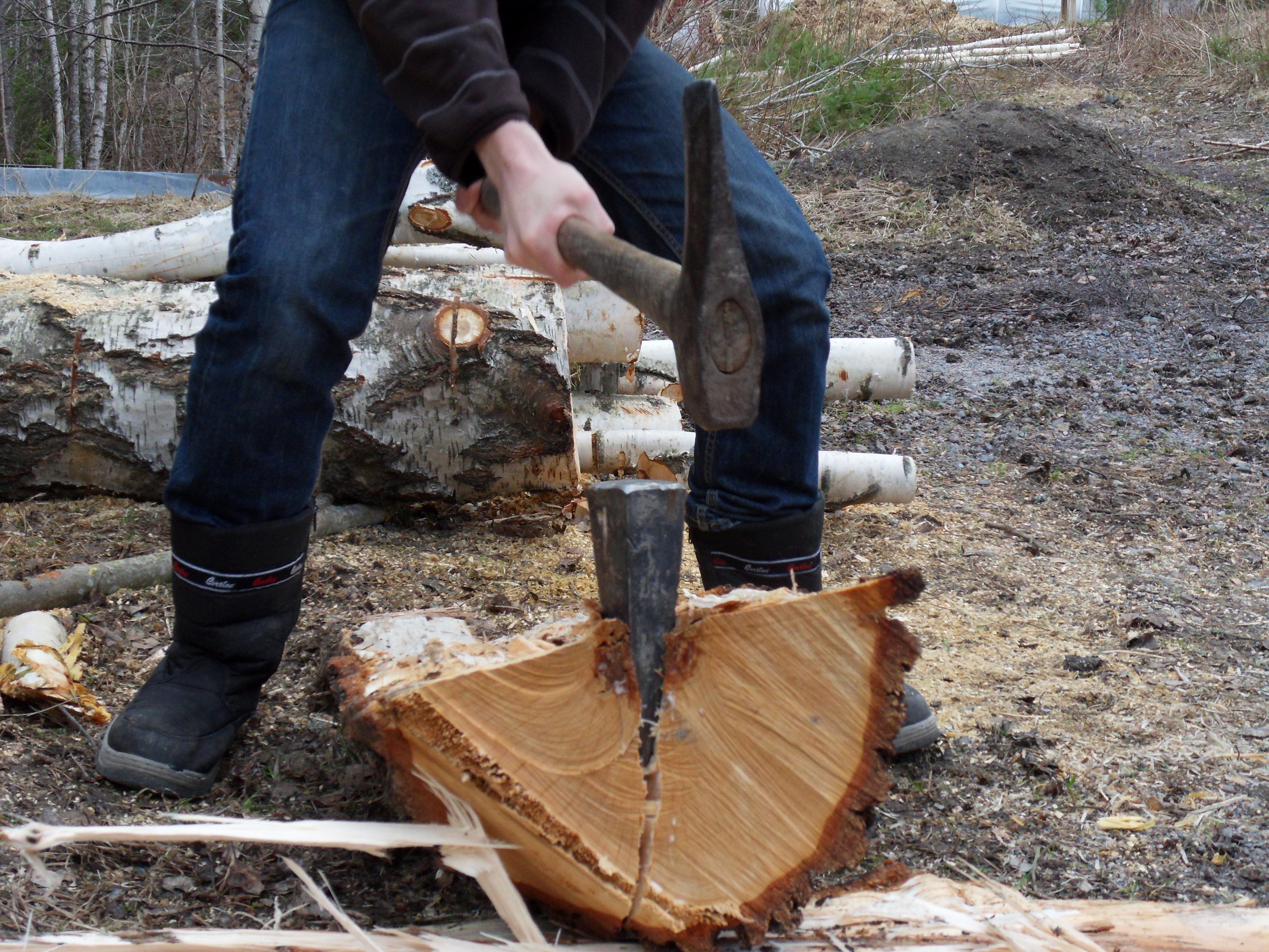 Vi har köpt en ”vedmaskin” en maskin som både kapar och klyver veden på en gång. Men den tar inte hur grova stockar som helst, så den stora björken vi fällde vid jordkällaren får klyvas för hand.