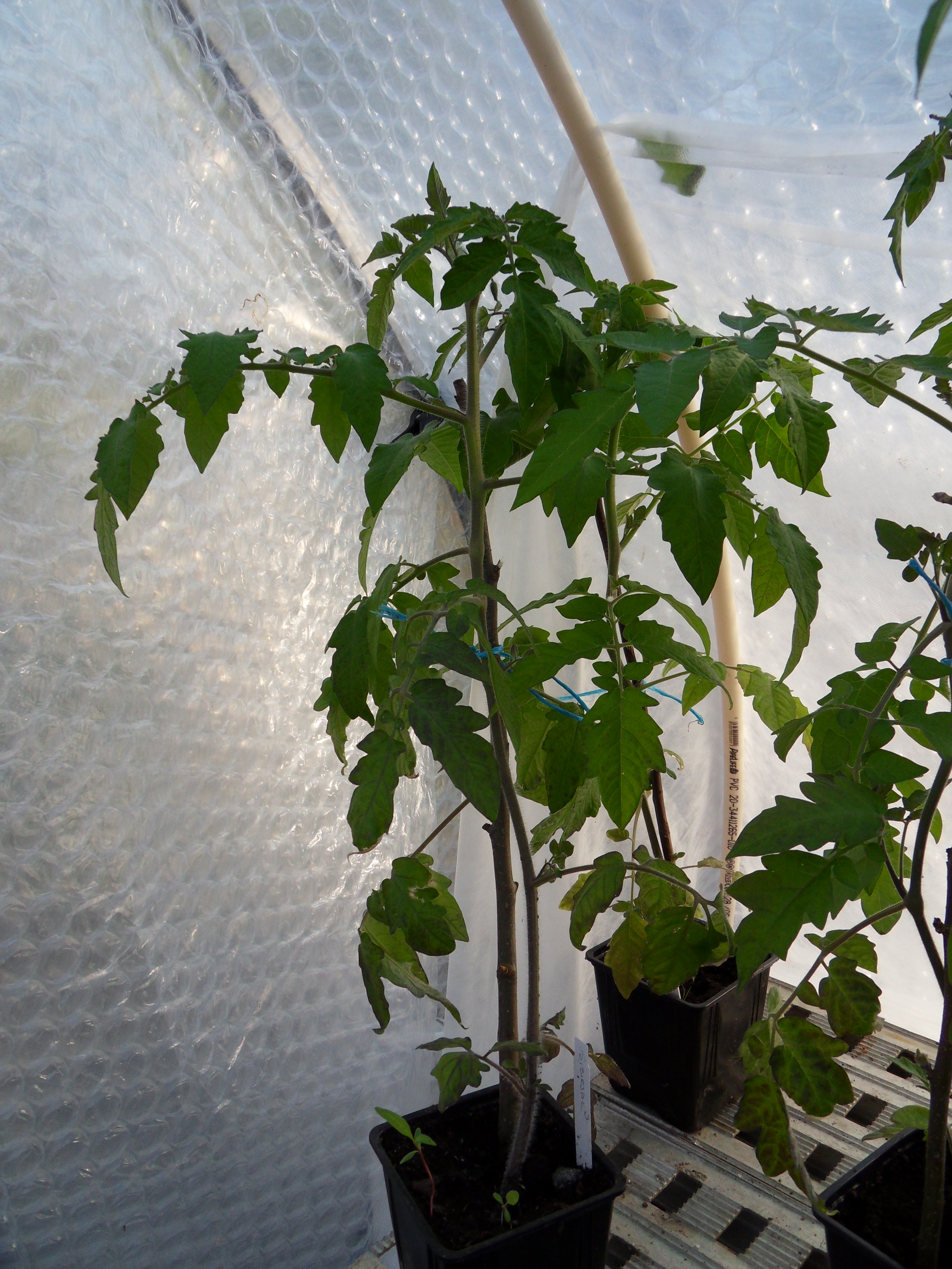 Tomaterna växer bra sedan de kom ut i växthuset, de har fått grövre stam och är riktigt kraftiga.