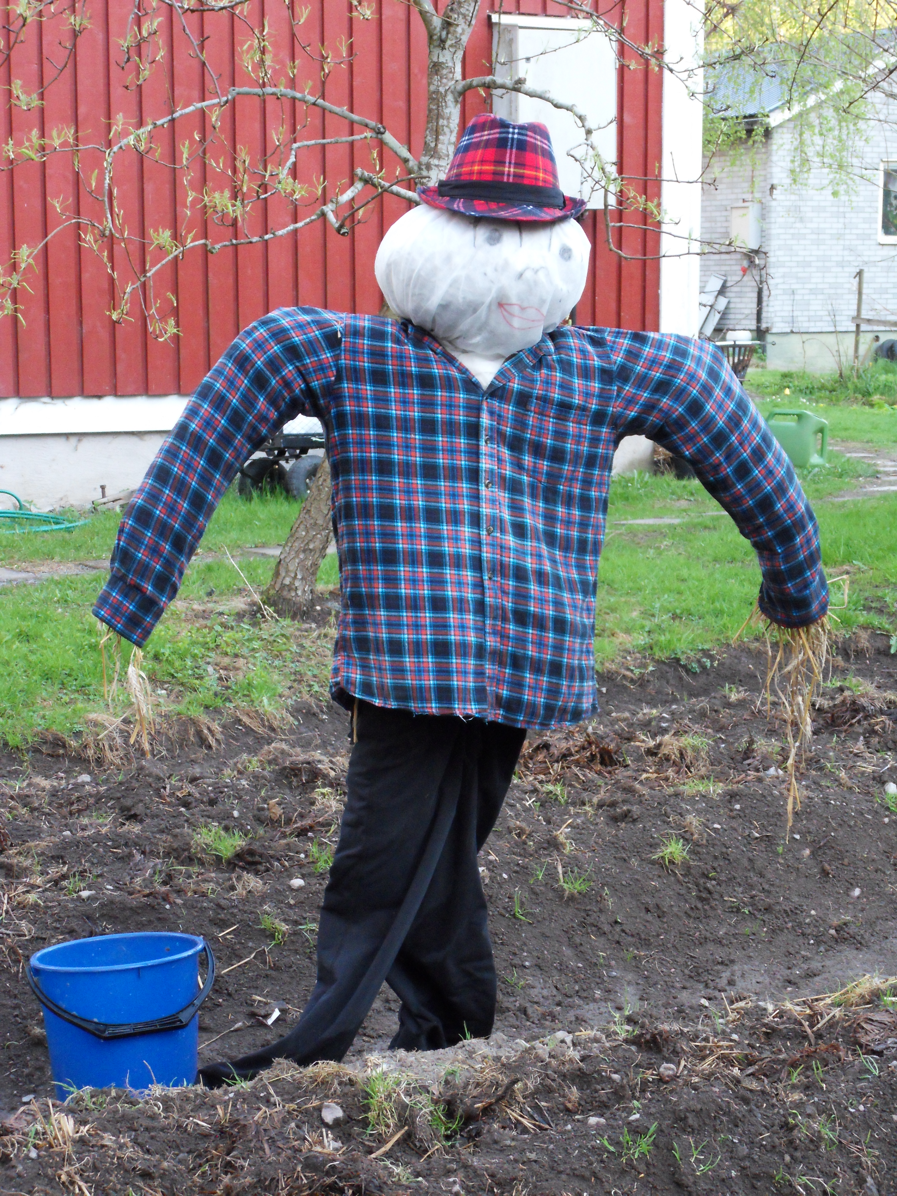 Så jag gjorde en fågelskrämma i all hast när jag kom hem på kvällen. Inte så snygg, jag blir skrämd av den själv när jag kommer ut ur växthuset så förhoppningsvis funkar den på rovfåglar med. Huvudsaken är ju att det från luften ser ut som att en människa är där.