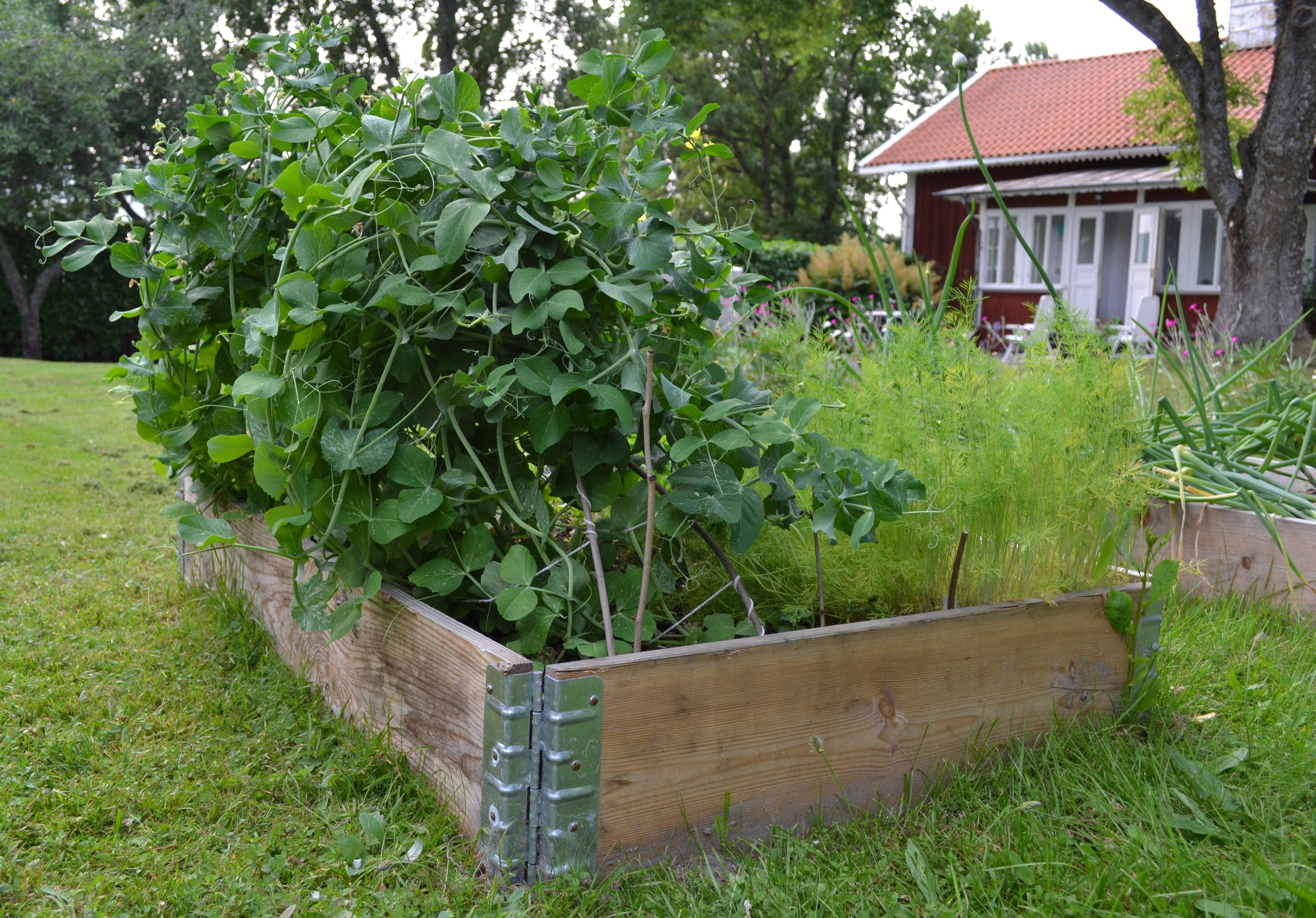 Till nästa år ska jag komma ihåg att så raderna lite längre ifrån varandra och sätta upp lite stadigare pinnar och snören. Nu är det lite svårt att se och plocka sockerärtorna.