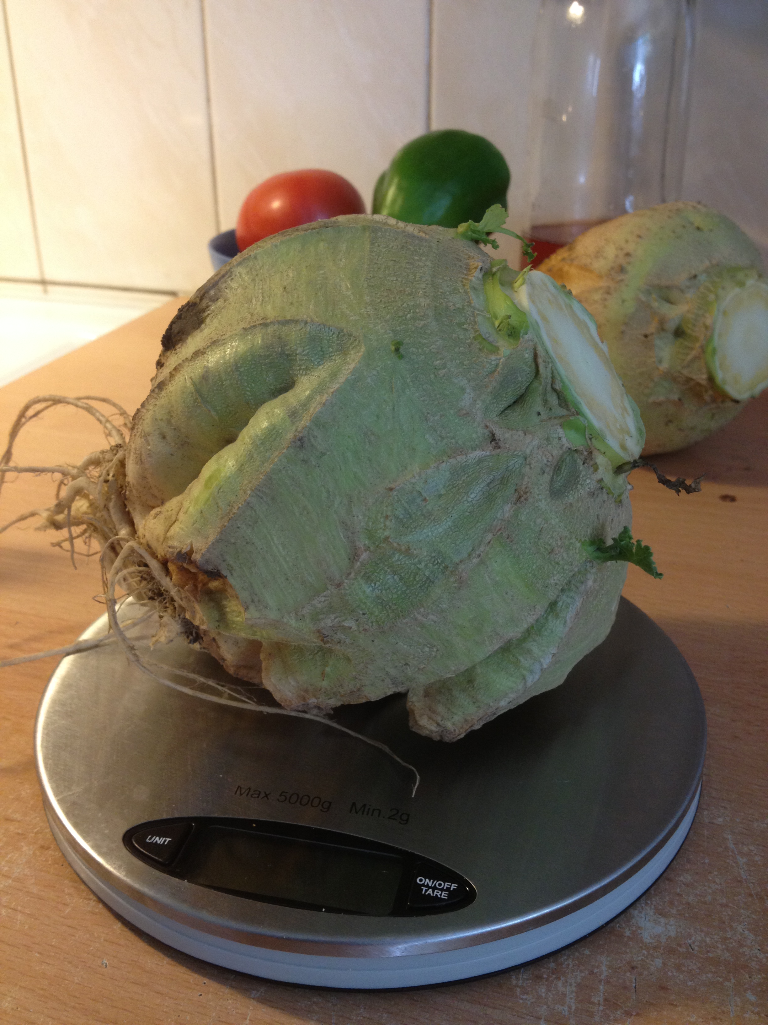 Det här är den kålrot som var på bild i förra inlägget, jag hann inte ta upp den innan vi åkte, den vägde nu lite drygt 1 kg. När man skördar, även kålrötter så luktar grönsakerna så mycket, inget man känner på samma sätt när man handlar grönsakerna i butik. Även om de grönsakerna man köper i butiken luktar vid skörd de också, så är det ju inget man känner av i butiken. Att odla själv ger så många mer upplevelser än man kanske först tänker på.