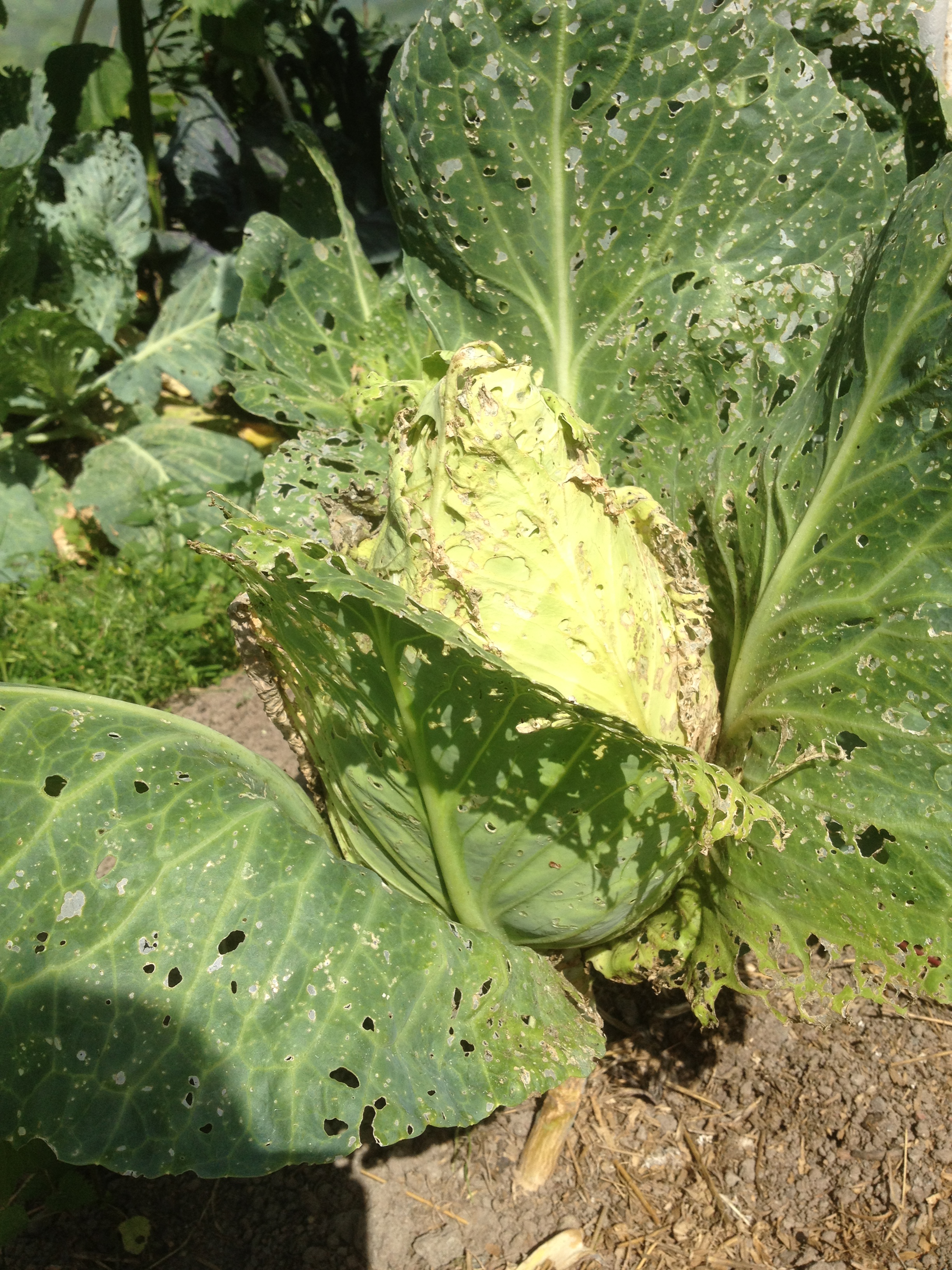 Savoykålen ser ut som en spetsduk från mormors linneskåp. I och för sig snyggt men inte om man tänkt sig att äta den. Fullt med larver och plantan tappar livslusten.