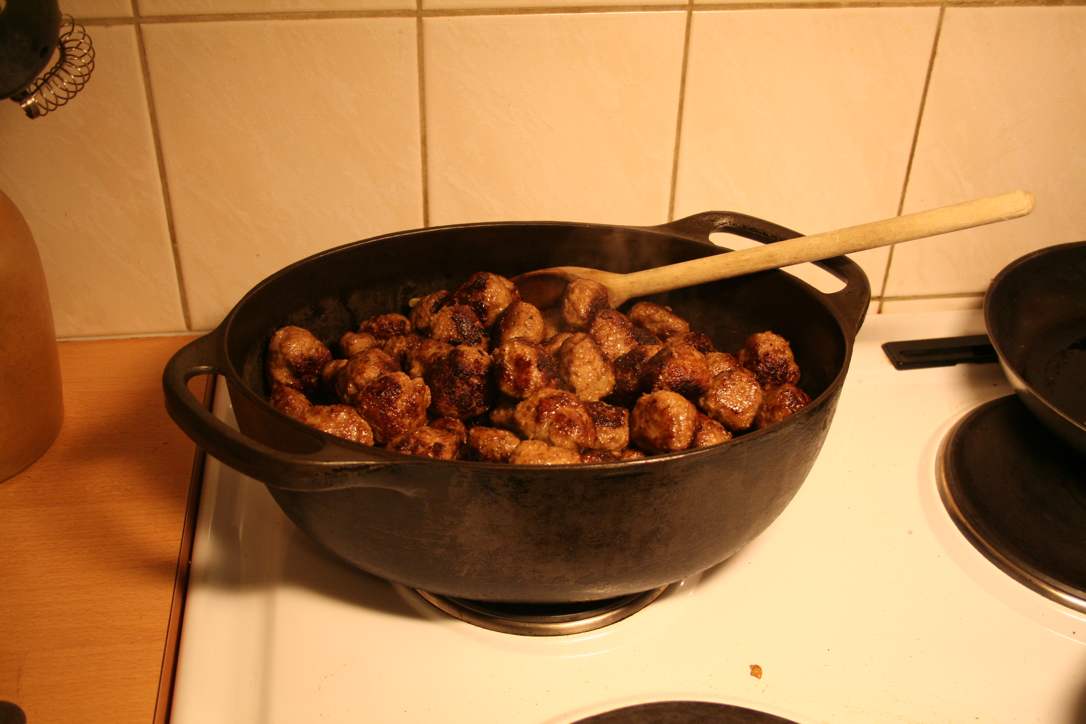 Köttbullarna brukar hamna på oss. Jag rullar och maken steker, han säger att jag gör dem för stora och jag säger de är lagom. Allt enligt traditionen.