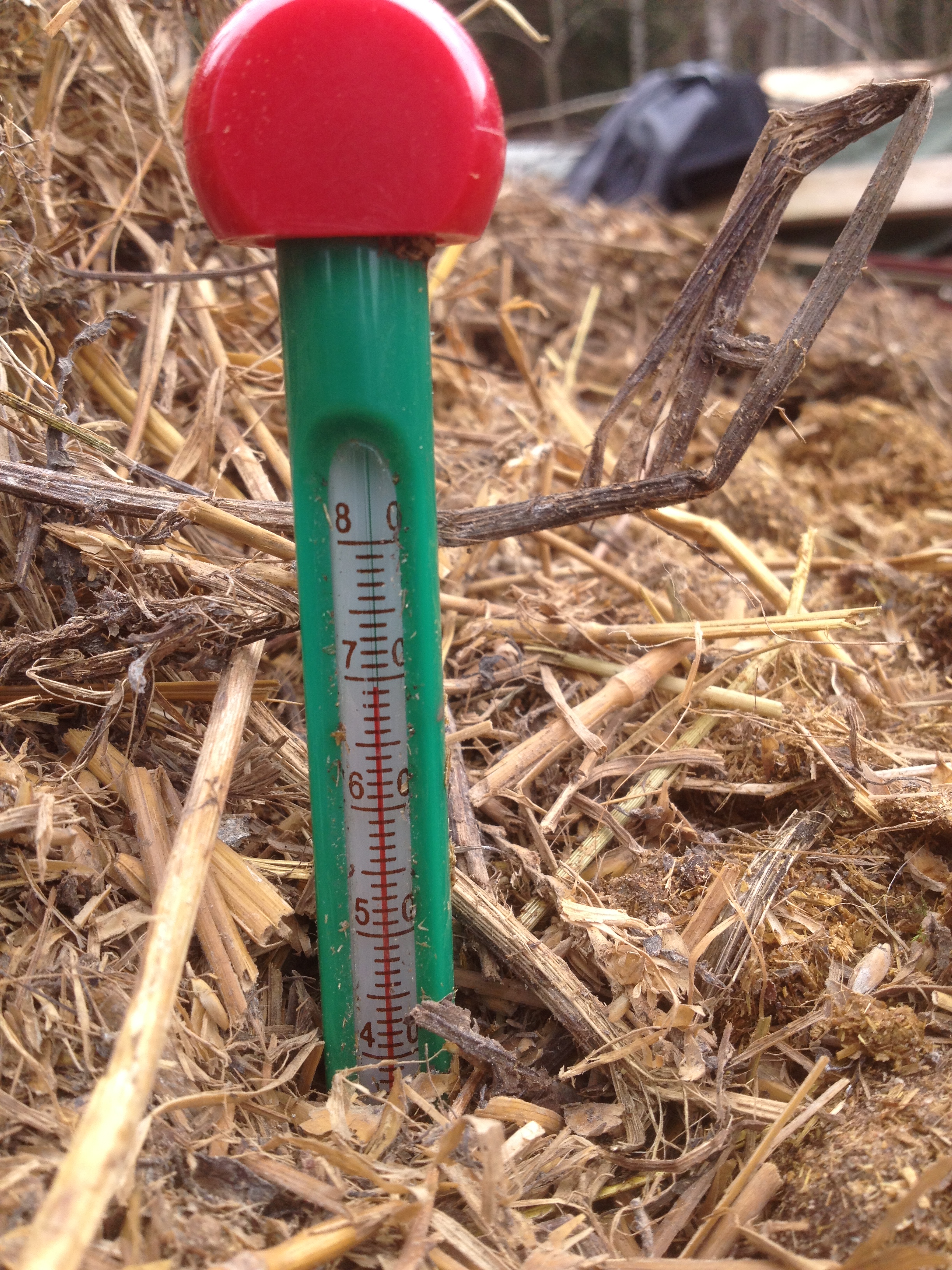 Gödseln är nu riktigt varm, 70 grader! När den svalnat lite och är nere runt 20-25 grader kommer jag att gräva ner hinkarna med tidigpotatis i gödseln. En jättestor varmbänk helt enkelt. Och i sommar sätter jag pumpa och squash i den, jag har odlat pumpa i kompost förr men då har komposten varit mer brunnen än den här kommer vara. Men jag provar i alla fall.