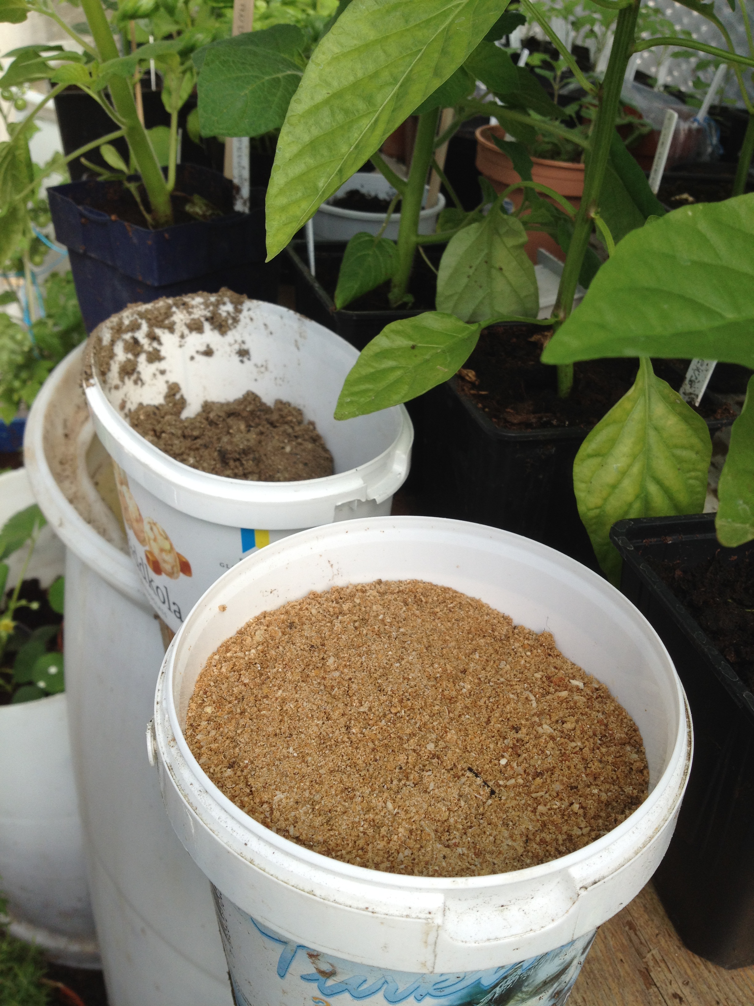 Det här är benmjöl och vedaska. Benmjöl innehåller fosfor som stimulerar blomning, rottillväxt bl.a. Vedaskan kalium och kalcium. Tomaterna får en näve av varje i tunnorna. Även trädgårdslanden får lite benmjöl när jag gödslar dem.