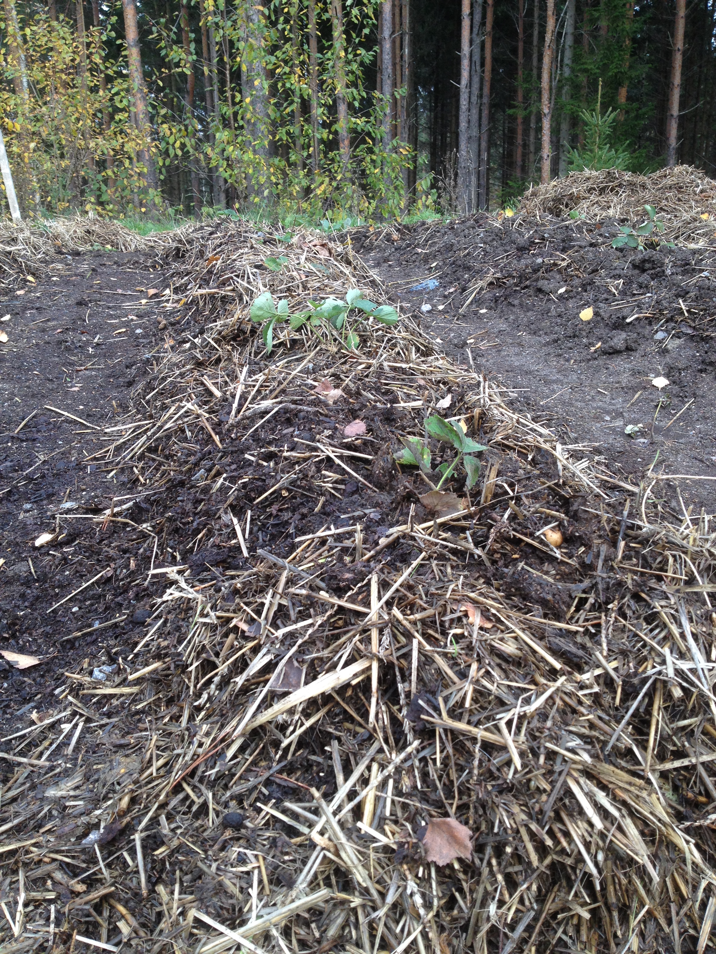 Förra helgen fick jag hjälp med att lägga upp den jord som fanns i ”halmlandet”, i lagom breda rader för jordgubbsplantor. Jag satte sedan ca 45 nya plantor av sorten ”Maxim”. Maxim ger riktigt stora, söta och goda bär. Om de får gödsel och vatten. Annars blir de små och hårda.