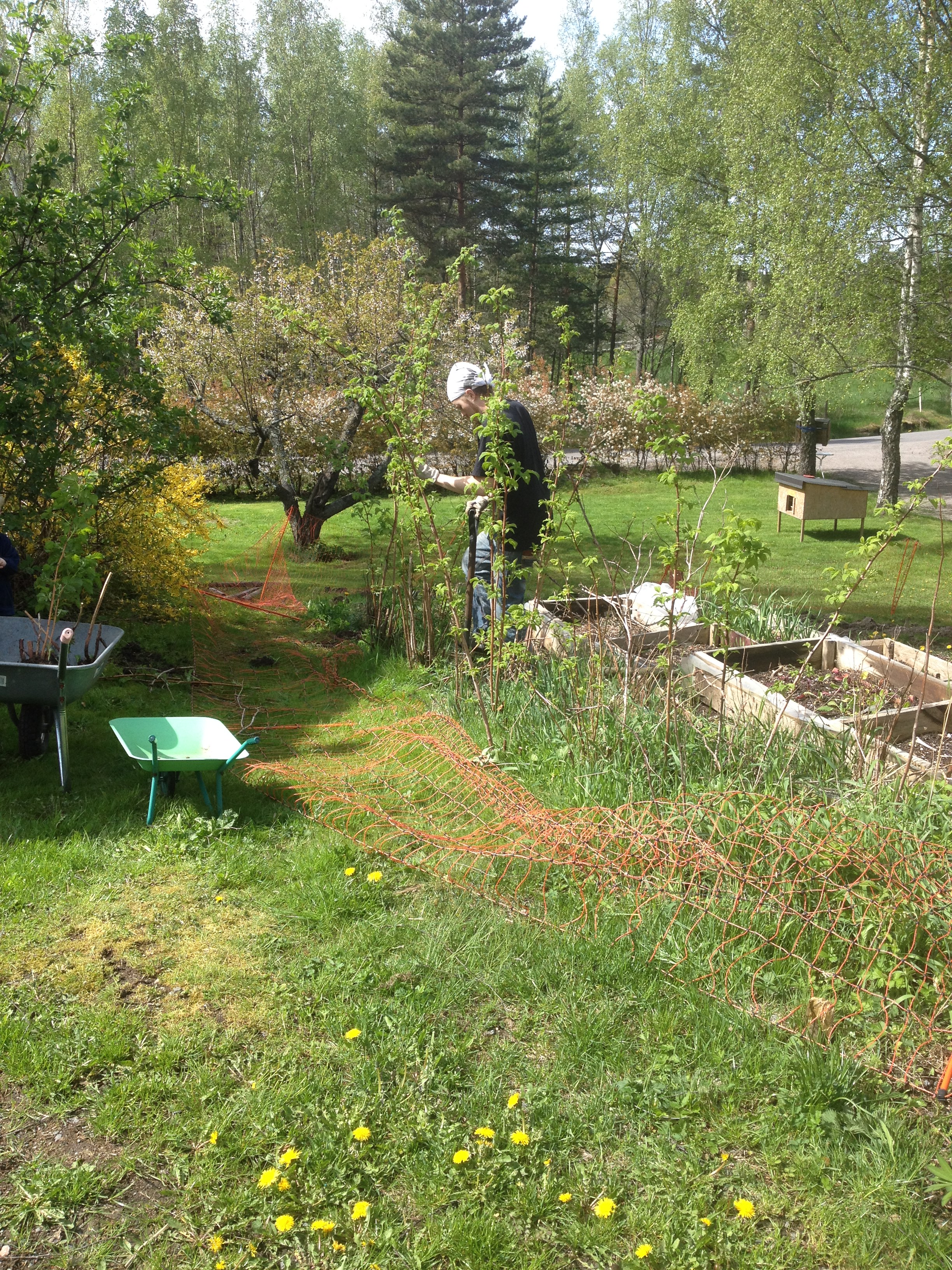 Vi satte plantorna några meter från det ställe där vi har ”halmlandet”, marken där är vansinnigt hård och full med sten, så att gräva hål i jorden med spade för att plantera var inte möjligt. Så vi gjorde på samma sätt som när vi anlade halmlandet för två år sedan. Täckte marken först med flera lager tidningar, lade på lite trädgårdskompost och lite brunnen hönsgödsel och satte plantorna i jorden.