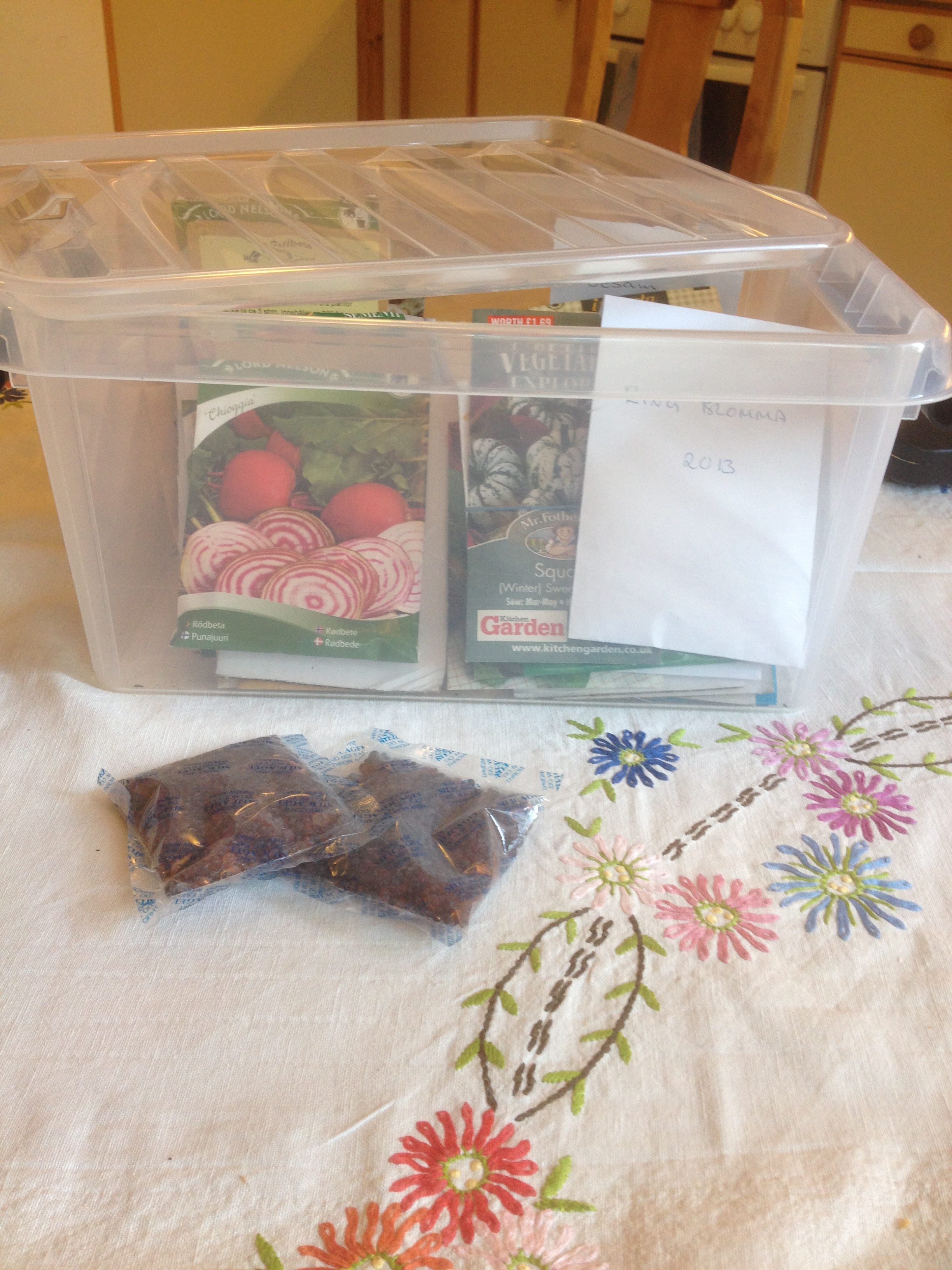 Lådan köpte jag på coop, en ganska stor låda så alla fröer får plats och i lådan lägger jag 3 påsar av avfuktningsmedlet och ställer sedan lådan i frysen. Men ärtor och bönor ska inte förvaras kallt, så de får fortsätta stå i groventrén. Sedan behöver jag bara titta till lådan i frysen ibland och torka medlet om det är fuktigt.