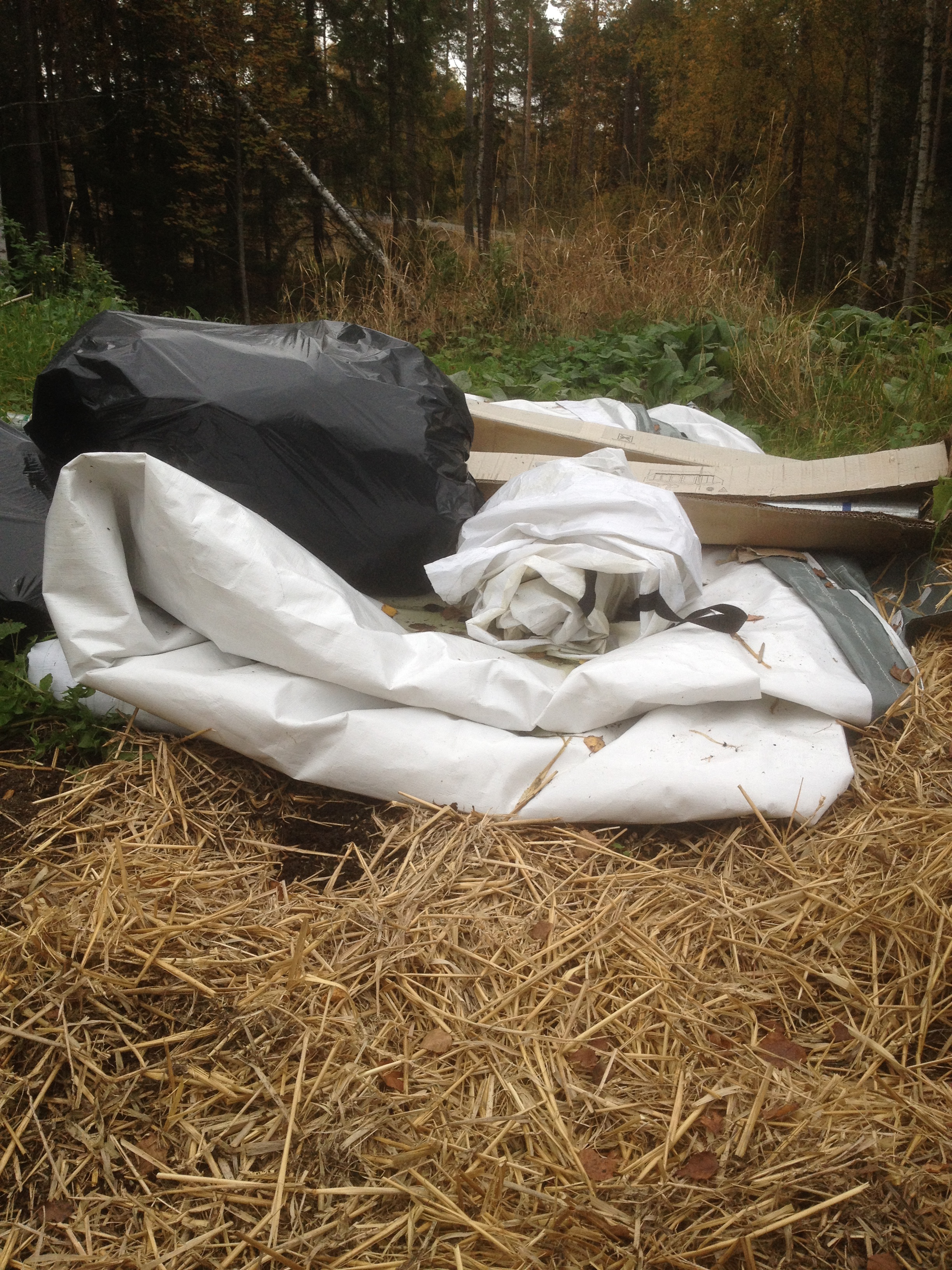Så nu ligger ett ca 20-30 kvadratmeter stort partytält och väntar på att Janne och vår svetskunnige granne ska ta sig an det hela projektet. Passar ju bra, jag köpte ju en stor bit växthusplast i våras. Vi kommer att ställa det där vi har ”halmlandet”. Bilder och ideer om hur vi ska göra det kommer framöver när de har tid att börja på det. Det ska bl.a. inte ha växthusplast på norrsidan, där ifrån kommer inte mycket solljus, så då är det bättre att använda tjockare material där som isolerar istället.