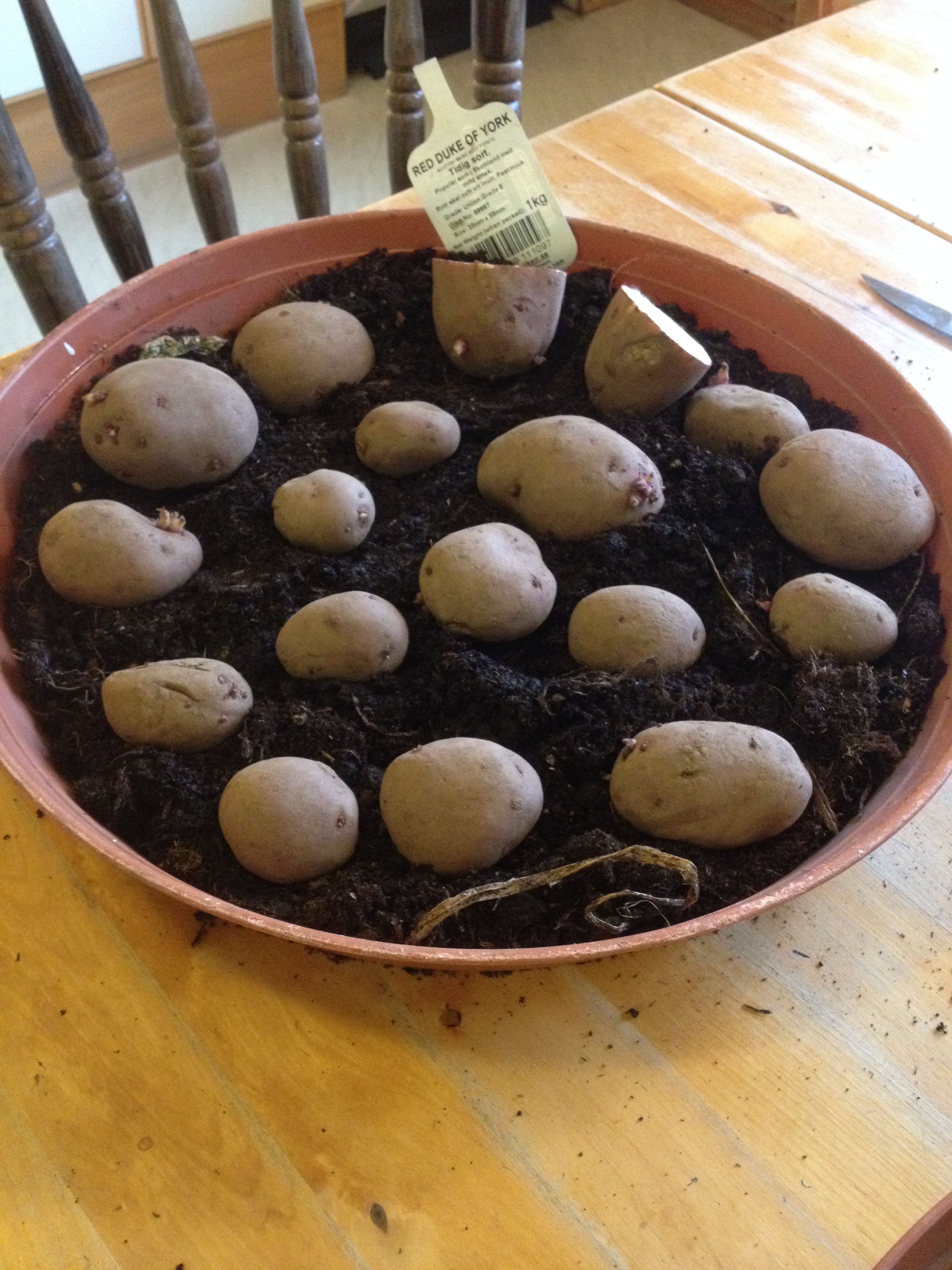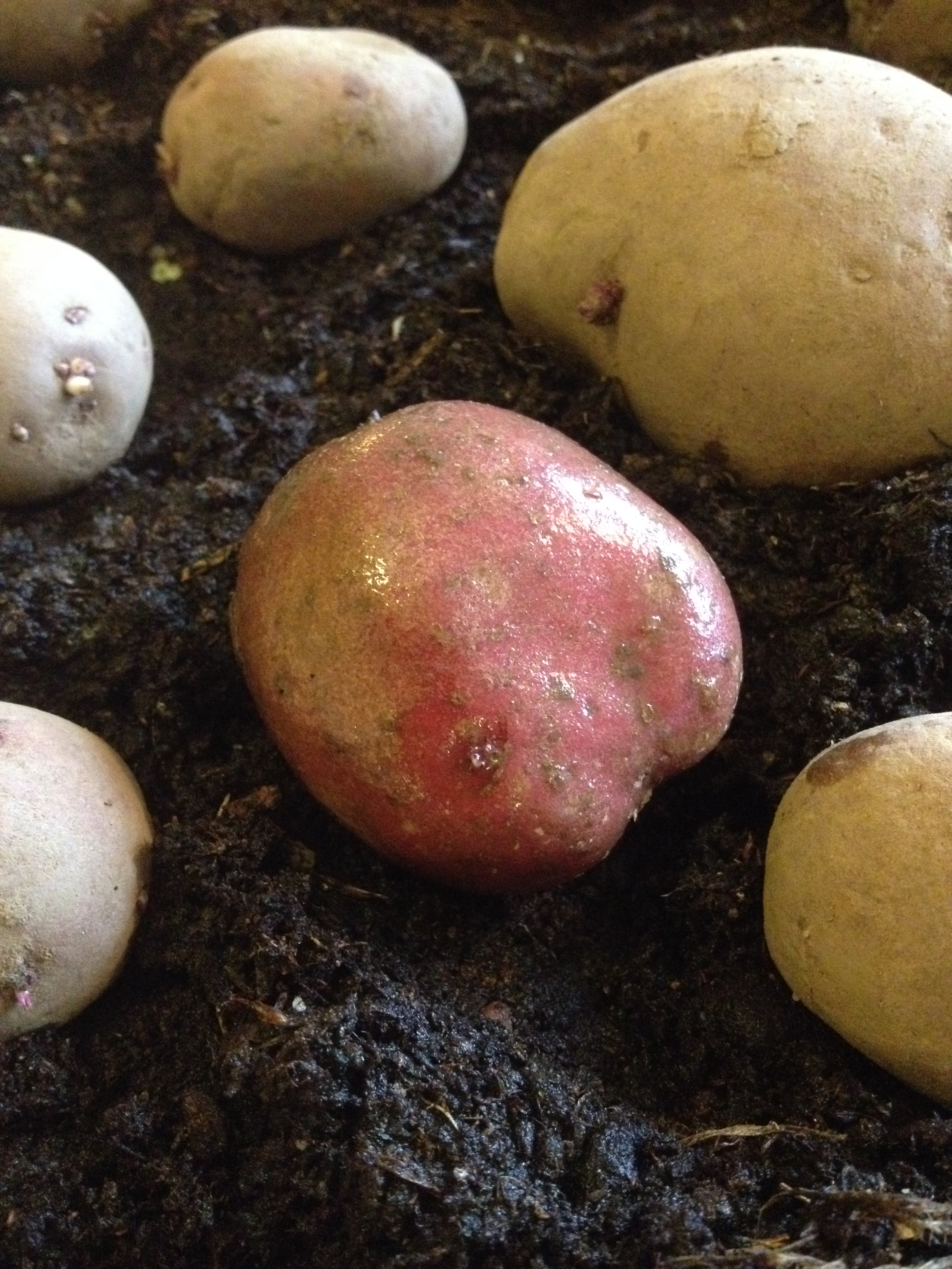 I år gör jag som Sara Bäckmo, förgror all potatis i lådor med lite jord i. Den växer till sig lite mer i jorden än om den bara får ligga i äggkartong och bilda små groddar.