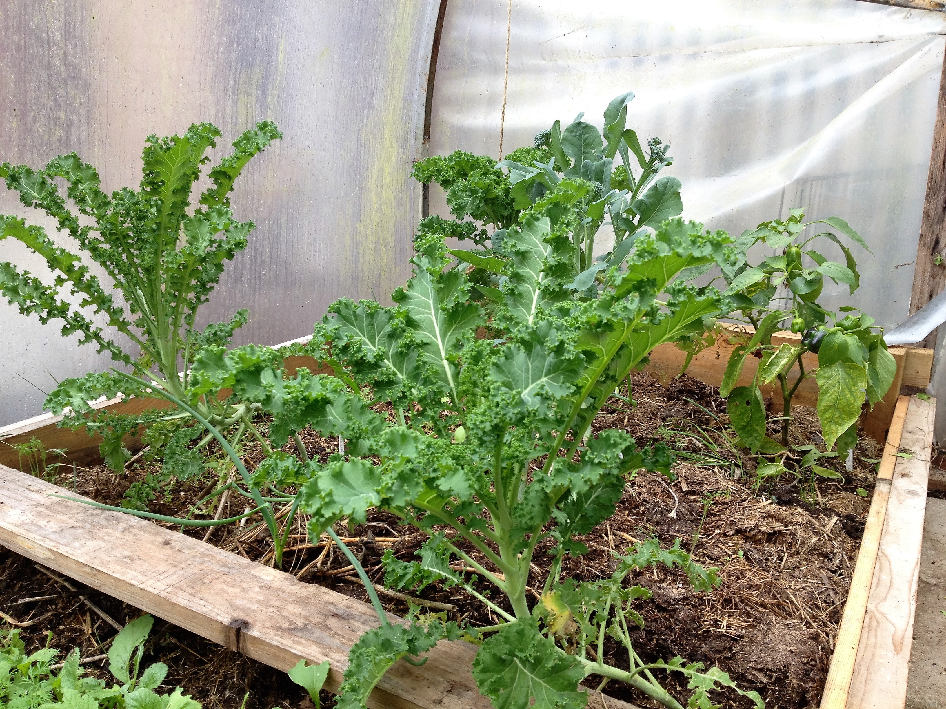 Den här grönkålen sådde jag i början på juli. Sedan fick den stå alldeles för länge i de små burkarna. För ca en månad sedan planterade jag i växthuset efter att jag tagit bort gurka och majsplantorna som stått där innan. De har vuxit på bra, trots att de blivit lite misshandlade under sommaren och att solen nu mer och mer lyser med sin frånvaro