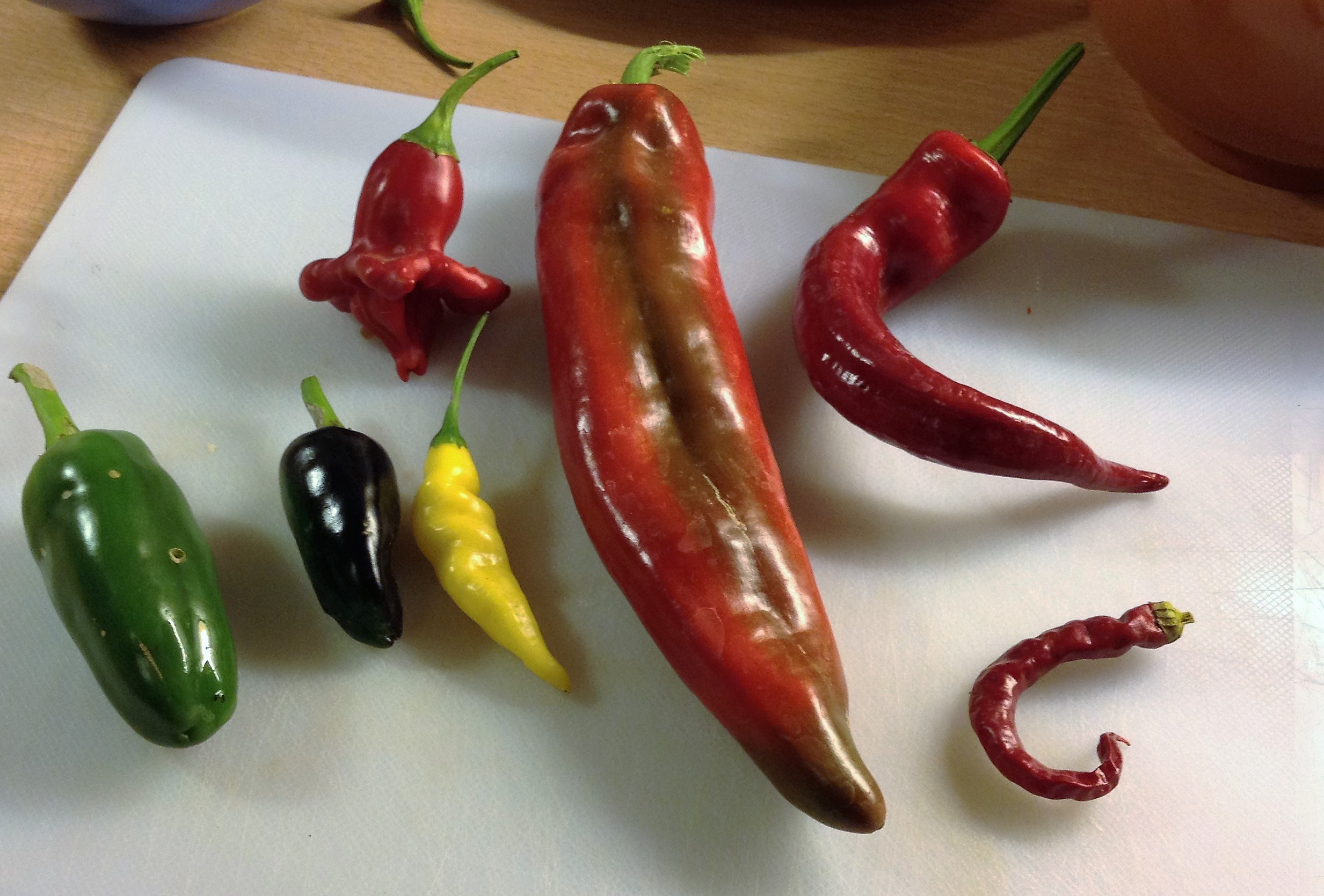 Chilisorter på bilden från vänster: Jalapeño, svart Jalapeño, Hot lemon, Anaheim, den stora krokiga är Alban. den lilla Cayenne long slim. Överst till vänster Jamaican Bell.