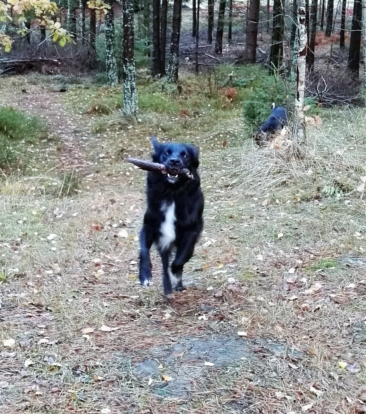I skarpt läge är det så svårt tycker Molly och jag lyckas till slut i stressen blanda ihop ”stanna” och ”sakta”. Jag ser den svarta tuppen försvinna över berget och det sista jag ser är en glad Border Colliesvans vifta efter. Jag vrålar stannaaaa Molly. Hjärtklappningen slår till med dundrande fart. En liten biverkning av utmattningssyndromet som envist hänger kvar. Bara att sätta sig ned en stund. Hoppas att inga granar är hemma idag tänker jag. Vi måste höras vida omkring, jag som hojtar kommandon, Molly som skäller glatt och tuppen som kacklar av skräck: Jag döör, jag döör. Efter några varv i skogen lyckas vi mota hem tupparna, Molly och jag. Puh. Nu ska jag ta lite te och Molly få några goda hundkex.