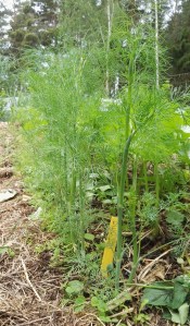 Dill kan vara en knepig historia. Här sådde jag en lång fin rad tidigt i våras. Den tog sig lite fjuttigt. De här fina plantorna är utplanterade från växthuset. Där självsåddes de i höstas. Jag sådde även en hel pallkrage i februari. De fröerna kastade jag ut och brydde mig inte om att mylla ner dem något särskilt. Där växer det nu en fin matta av dill som ska skördas i veckan. Sammanfattning: man ska inte göra sig till med dill.