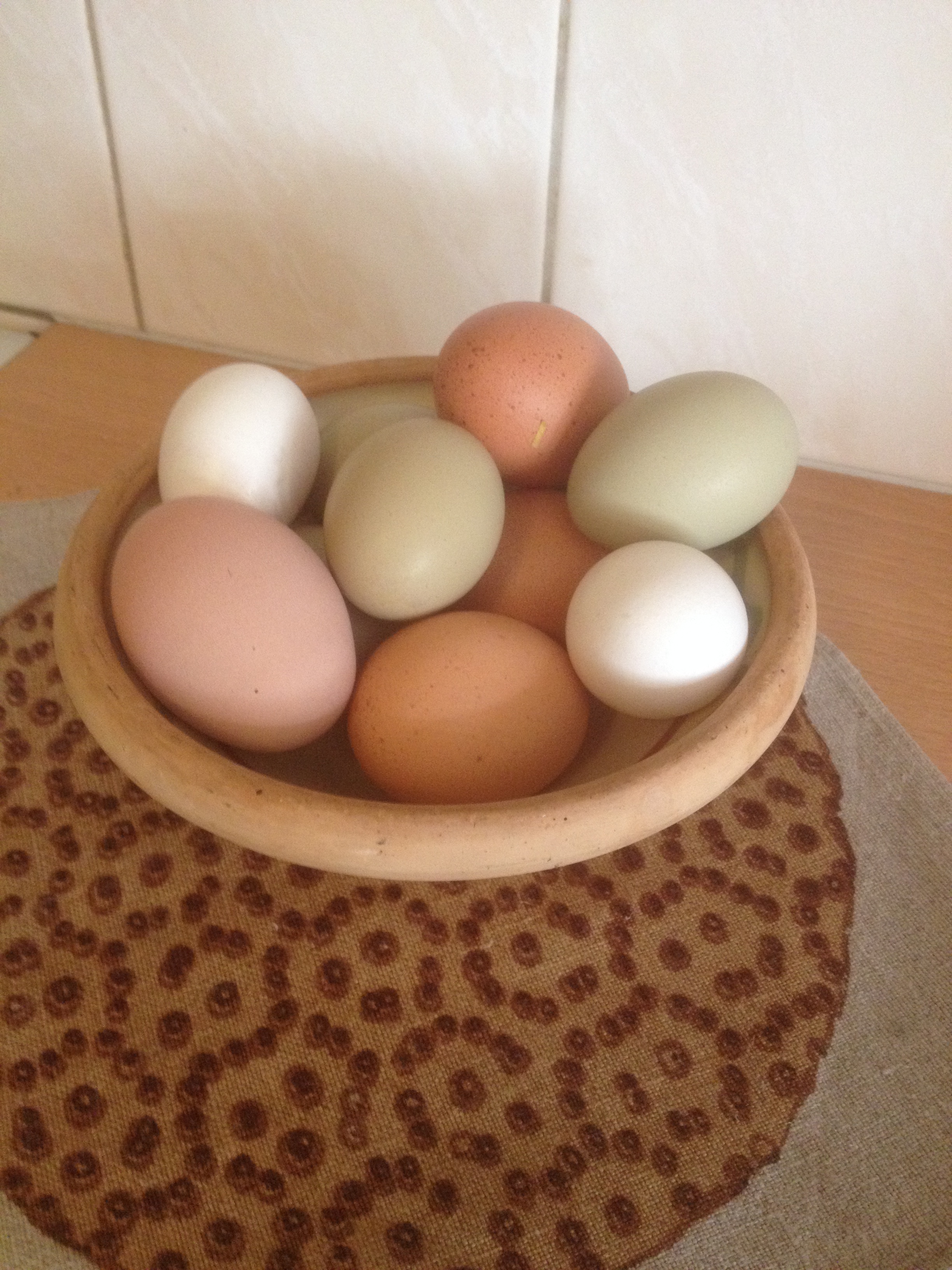 Jag köpte de här raserna dels för att få ägg i fler färger. Det ser så himla fint ut i äggkartongerna och det är roligt med lite olika raser och färger på hönsen. Och inte behöver man måla påskäggen längre med ägg som är så fina helt naturligt. Nu ska de få vila tills i morgon.