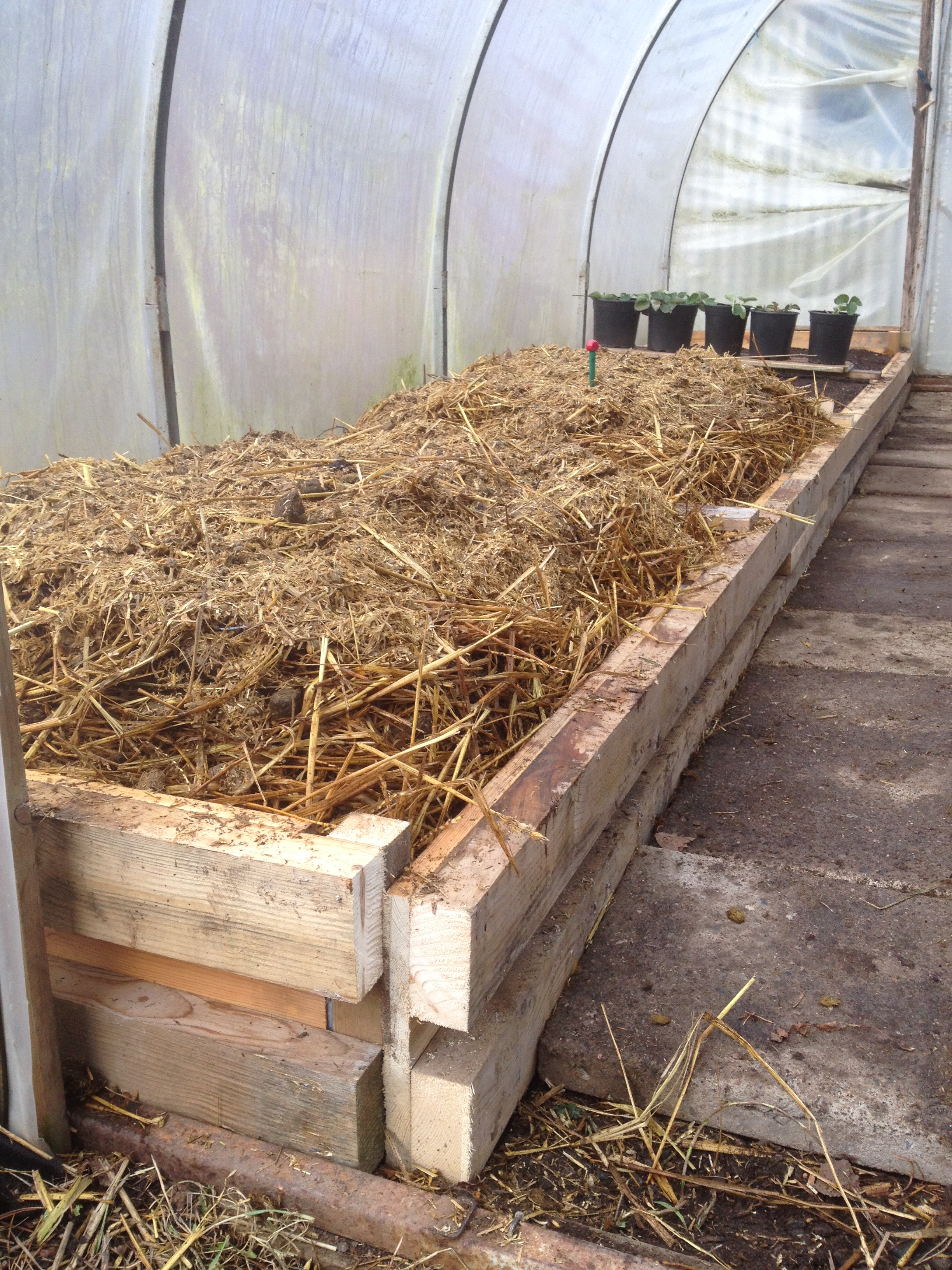 Jag strör med Easy strö hos hönsen ( riven halm från svenska foder). Hönsen får också vanlig lång halm. Så gödseln består av ganska mycket halm redan från början. Jag blandade ungefär en kärra gödsel och en kärra halm. Jag lade inte på hela kärran gödsel på en gång utan tog ca fem cm lager gödsel, ett lager halm, fem cm gödsel osv. Varmbänk är ingen exakt vetenskap, man får prova sig fram.
