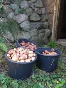 Nästa år räknar jag med att vi behöver ca 100 kg vinterpotatis. Om jag tar ett medeltal av skörden vi brukar få så kan jag räkna med att få 8 kg skördad potatis av 1 kilo sättpotatis. 100 kg delat med 8 ger 12,5 kg sättpotatis.