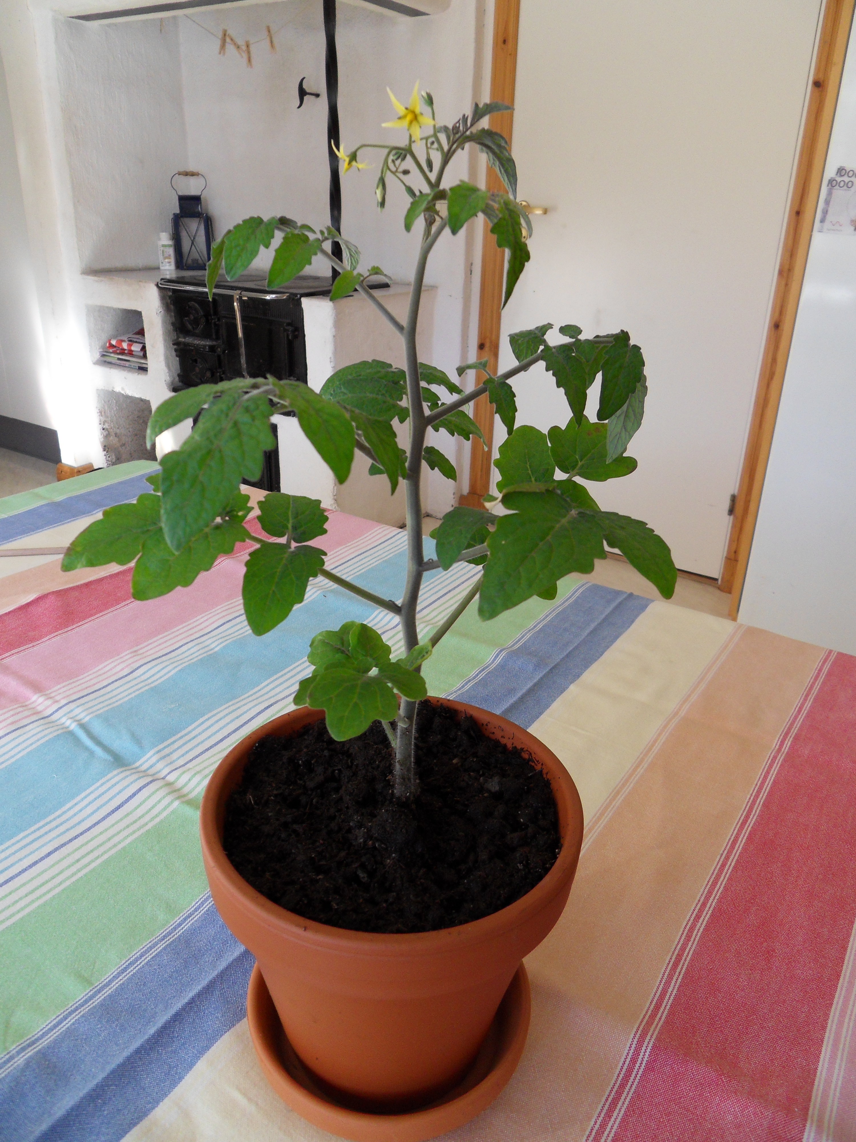 I den här krukan planterade vi 3 st plantor. Jo det finns en kruka där någonstans. 🙂 Den stod sedan på den inglasade balkongen på äldreboendet där pappa bor. Den var mycket populär och gav mängder med tomater. Här är den totalt översållad med blommor.