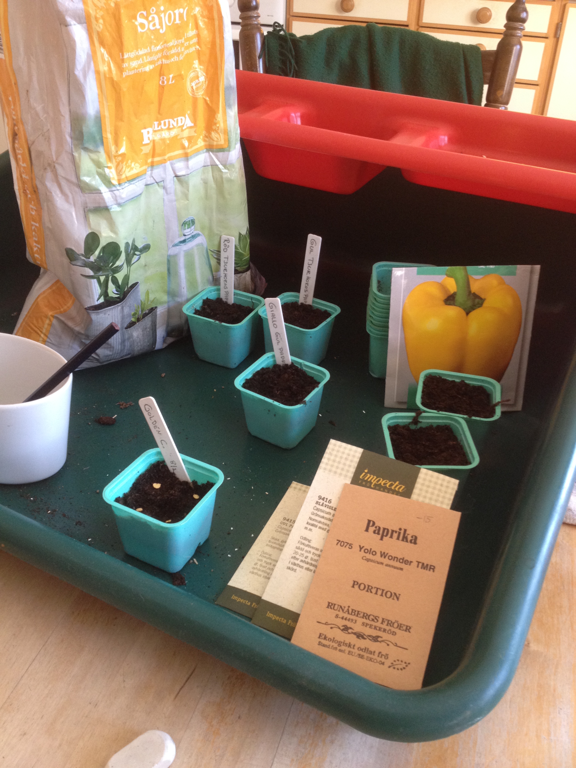 Dem råd som ges i de flesta böcker och av kunniga odlare är att så tomater ungefär 6-8 veckor innan utplantering. Under de 6-8 veckorna behöver plantorna planteras om en eller två gånger. Varje gång till en lite större kruka. Får de stå för länge i sina krukor innan utplantering är det risk för att rötterna inte har plats att utvecklas ordentligt och plantan stannar av lite i sitt växande. En del är extra känsliga, som paprika. De kan ha svårt att återhämta sig ordentligt, efter att ha stått trångt för länge. Vilket kan ge lite sämre skörd. Något som kan vara bra att tänka på när det kliar i fingrarna såhär års och man vill komma igång! Räkna bakåt, kan du sätta ut tomaterna runt 20 maj, bör du så dem 6-8 veckor innan dess. Runt 20 mars.