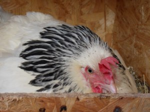 En av hönorna började ”skrocka”, en del kallar det för att hönan är sur och det finns säkert fler benämningar beroende på var i landet man bor. Vad som menas är att hönan vill ruva.