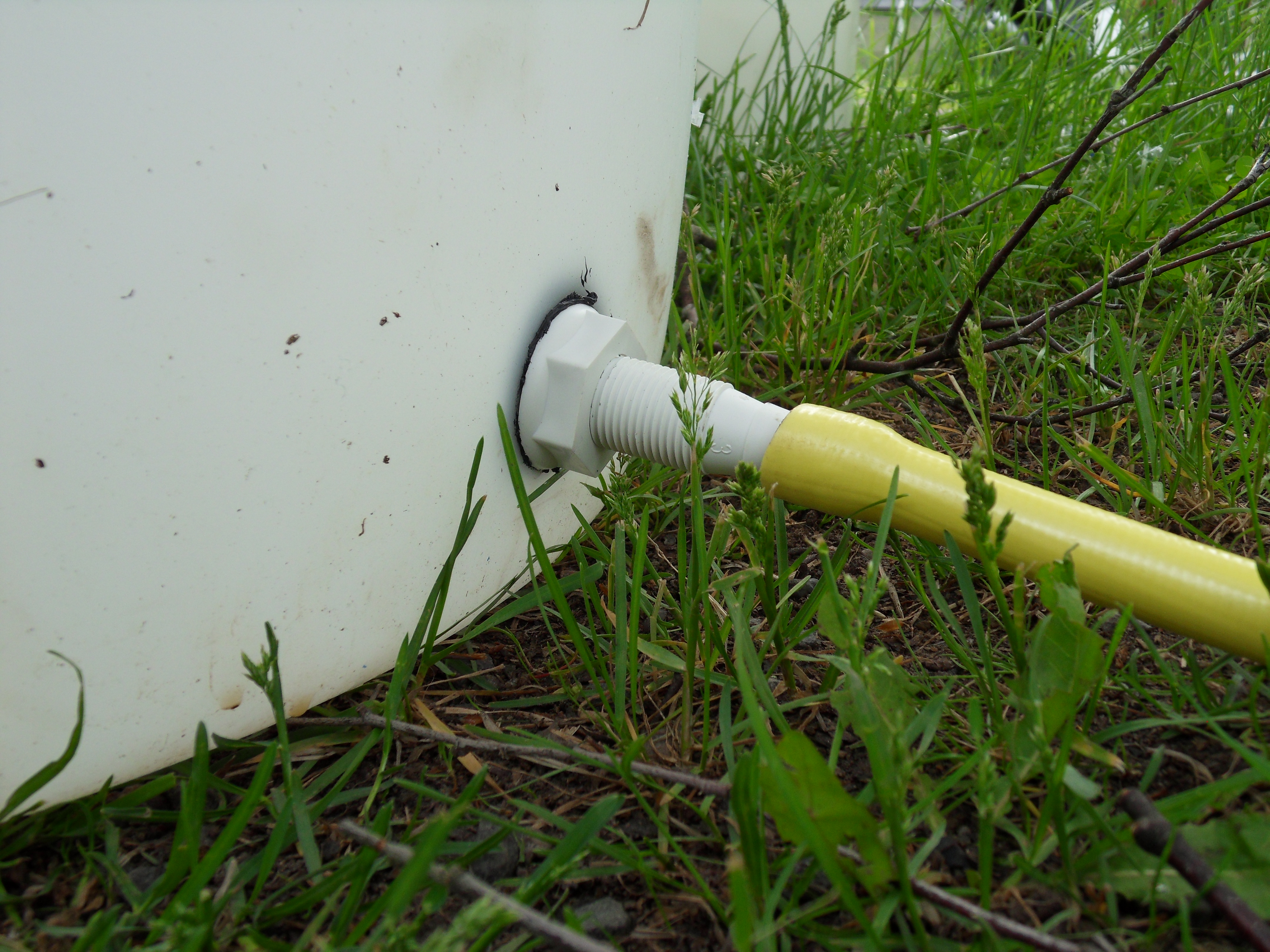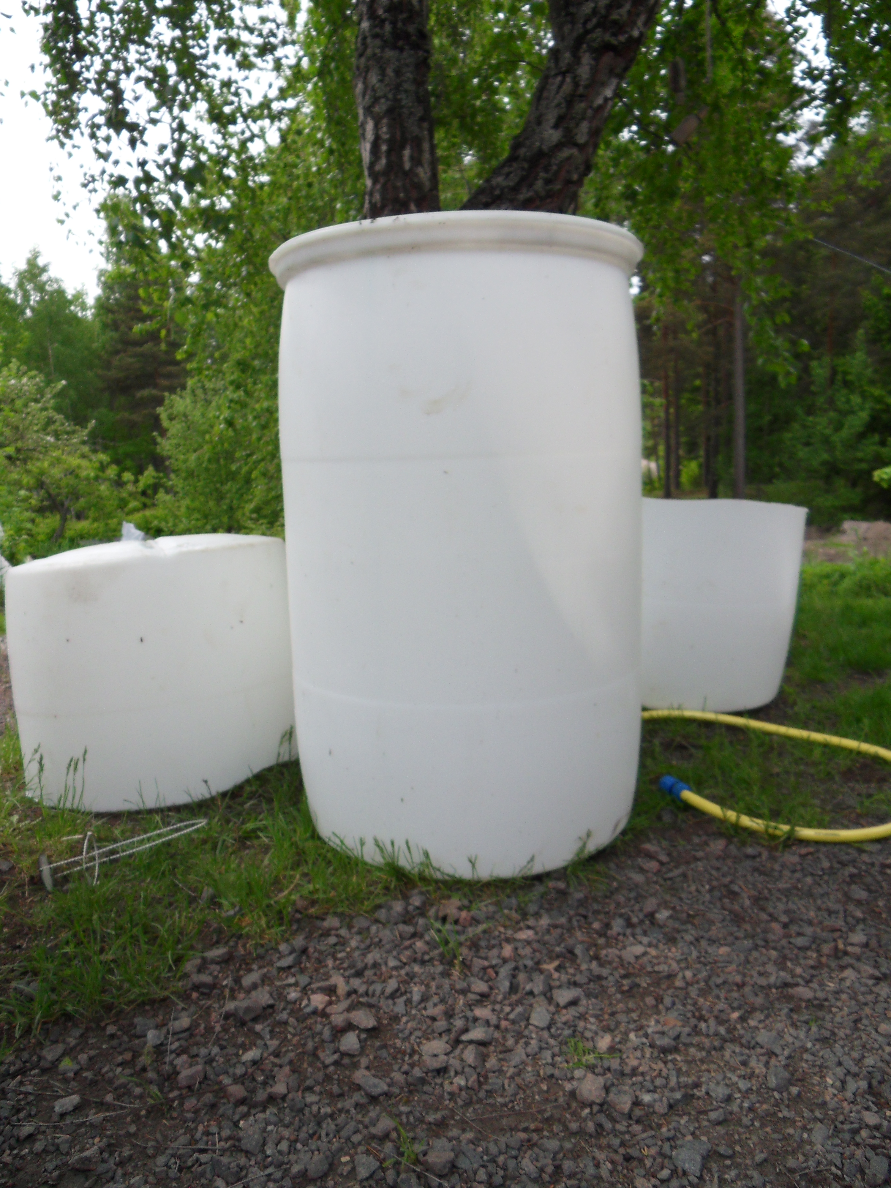 I år har vi satt ”fällbara utkastare”, (som finns att köpa på byggvaruhusen), på alla stuprör på bostadshuset. Även vid små regnmängder fylls tunnan på 200 l förvånansvärt snabbt. Vi har vita plasttunnor, de är absolut inte snygga men jag fick dem och de är stora. Tunnorna kopplar vi ihop med slangar som jag skrivit om i det här inlägget, så är vi inte begränsade till en tunna vid varje stuprör när det väl kommer en större regnskur.