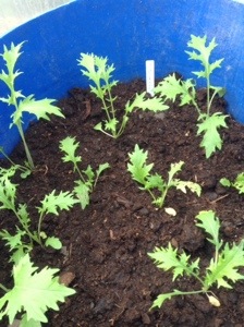 Den 1 februari sådde jag också spenat ( sorten Matador) i en pallkragen utomhus. Tjälen har bara släppt i det allra översta lagret jord, 3 cm ner är det fortfarande stenhårt. Men även där har jag sett några små, små gröna hjärtblad kämpa sig upp.
